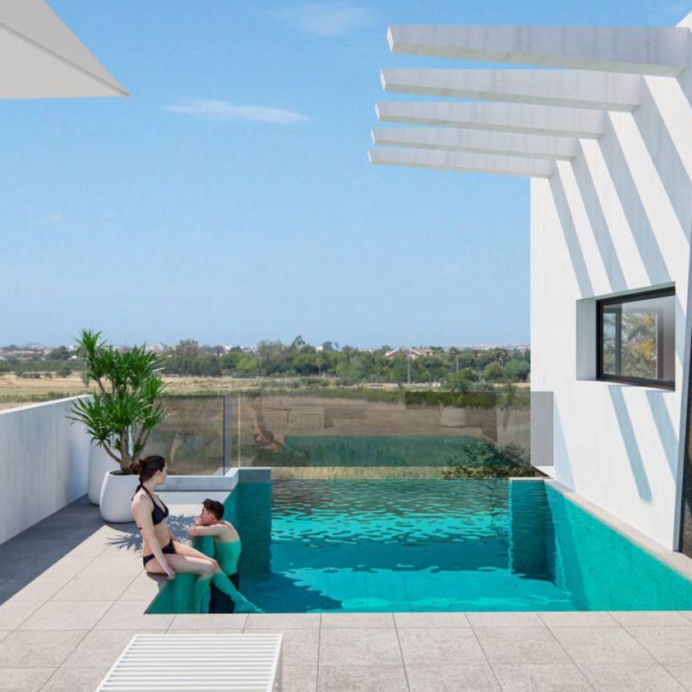 Bungalows in Pilar de la Horadada, Costa Blanca This promotion is located in an unbeatable enclave within a large residential area of Pilar de la Horadada (Alicante), next to ‘la Rambla’, a privileged place for families due to its easy access to all kinds of services. The modern-style residential complex is made up of 8 apartments with separate entrances, 2 and 3 bedrooms, with a large garden or solarium area. A building with a commercial space on the ground floor and 2 3-bedroom apartments with a large terrace and solarium area. It also has an impressive rooftop pool and garage spaces in the basement. Property ID: GH-24154-D Price: €239,900 Property Size: 84 m2 Land Area: 128 m2 Bedrooms: 2 Bathrooms: 2 Property Type: Apartment Property Status: For Sale