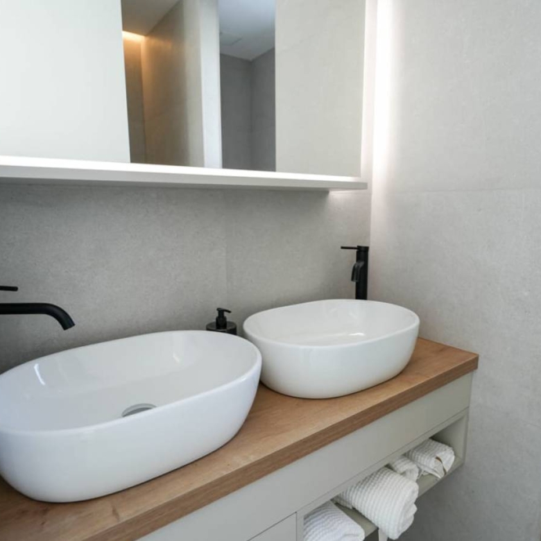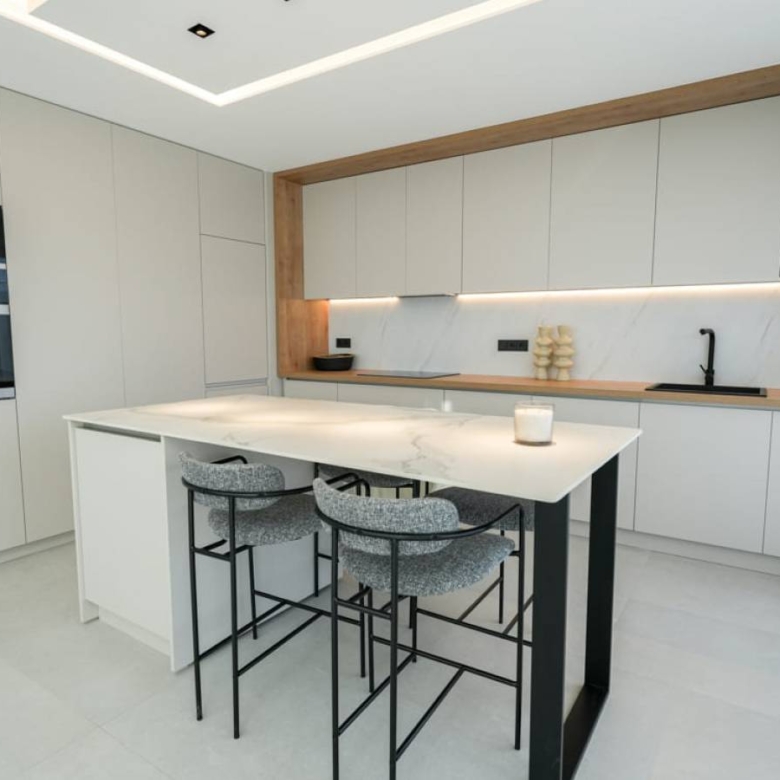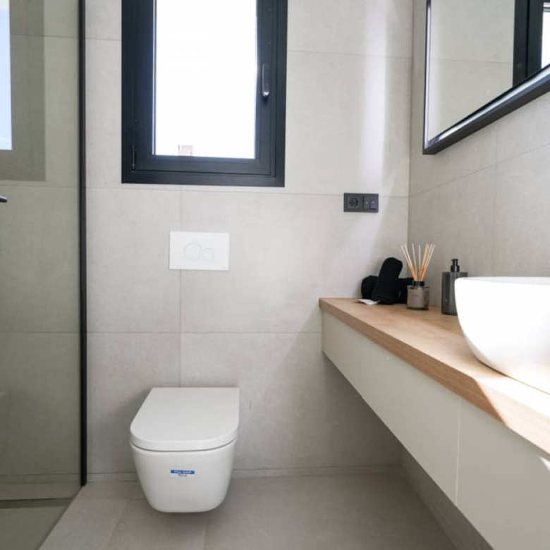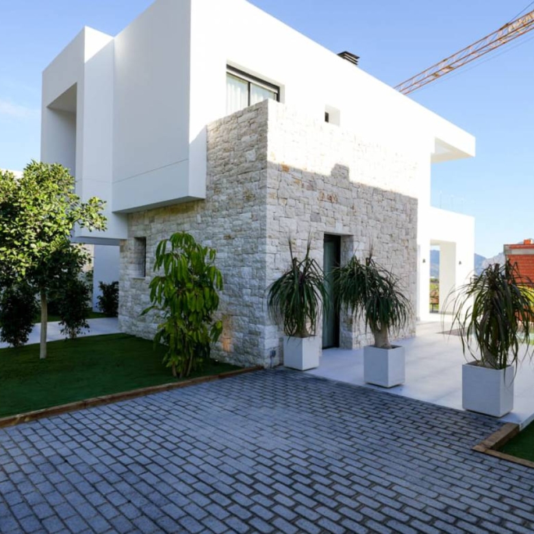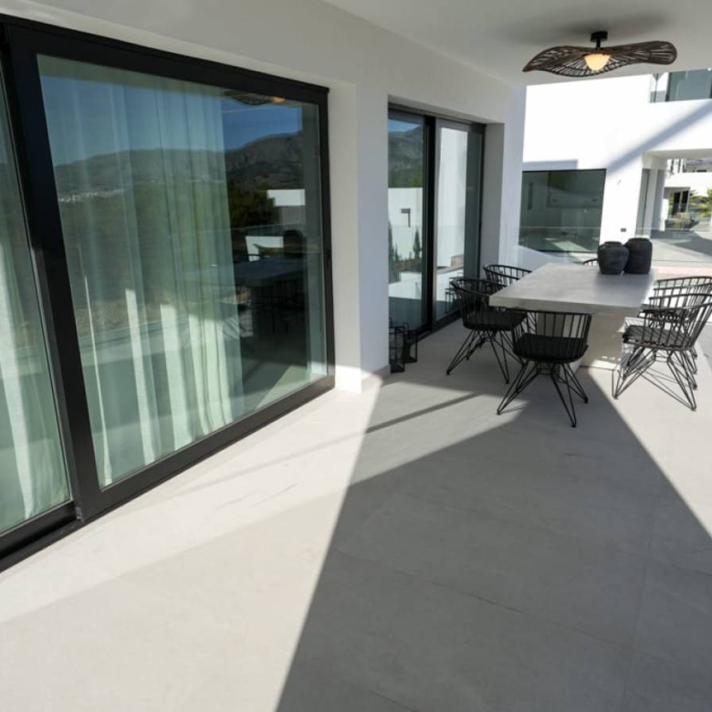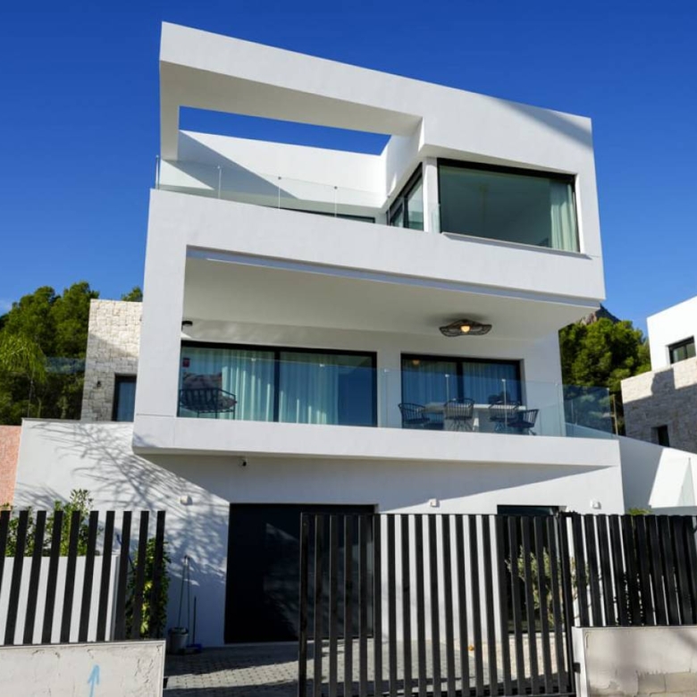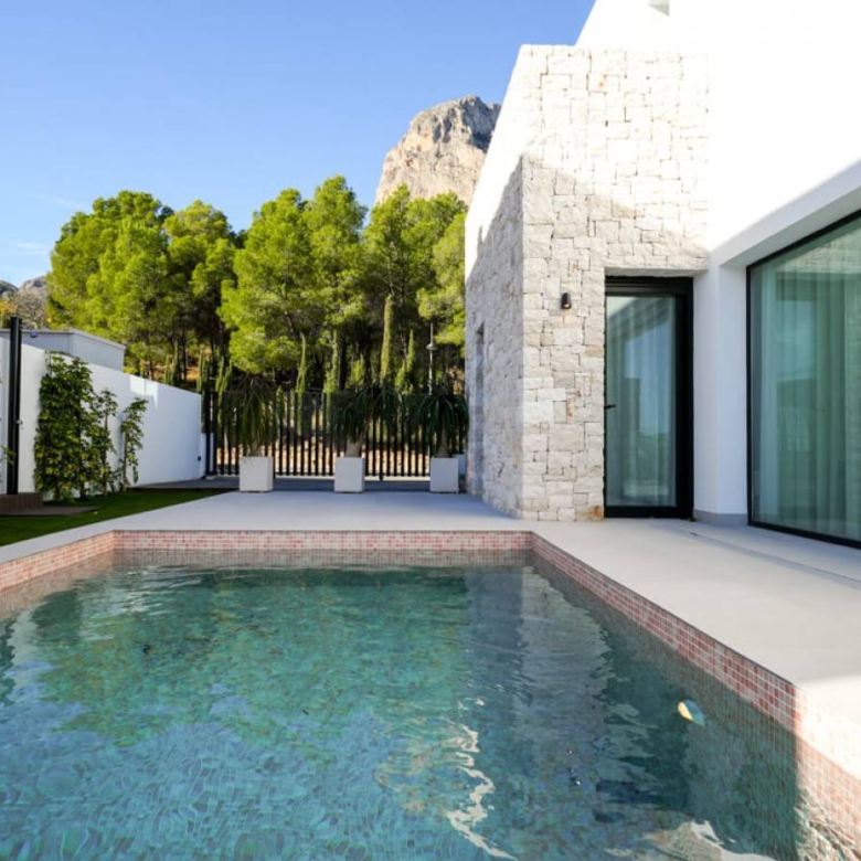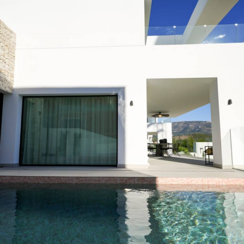Villas for sale in Balcon de Ponoig, Polop, Costa Blanca, Spain 6 properties situated in a very natural environment. The houses have a basement, and a constructed area of more than 290m2. The plots have a little more than 420m2. They have underfloor heating and multi-zone air conditioning. A huge kitchen is coupled with a very bright living room and a ceiling of more than 6 meters. The house has 3 bedrooms, one on the ground floor and 2 on the first floor. The basement allows for many options to make another room, because it has a window with natural light, with access to make a closed garage, a play space for the children, a cinema room, a gym, a library or simply a huge dressing room or storage room. The exteriors are generous and an infinity pool encloses the main terrace with views of the Bernia mountain range. Upstairs the views are marvellous and complement a villa that is already magnificent for its spaces and qualities. Property ID: GH-307726 Price: €680,000 Property Size: 293 m2 Land Area: 416 m2 Bedrooms: 3 Bathrooms: 2