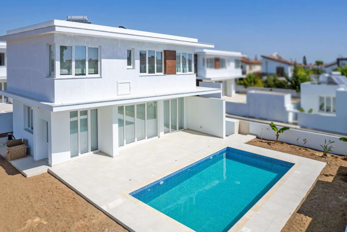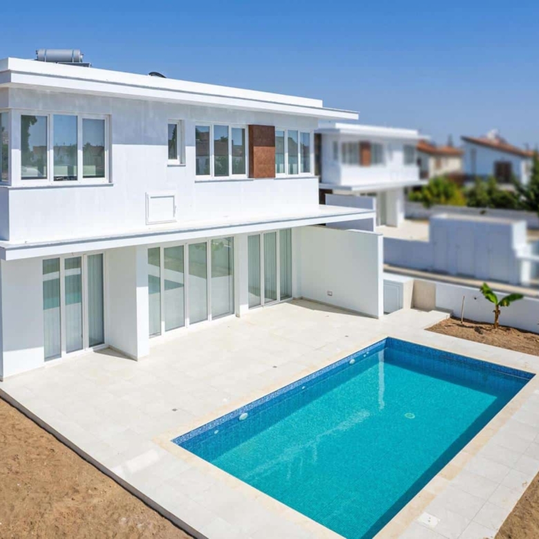 This amazing property is a 2 storey detached villa with modern design, high quality construction standards and class A energy efficient. It is one of seven available detached houses of the gated complex, perfectly positioned with south orientation making them airy and sunny. Configured with open plan kitchen/living area, guest wc, on the ground floor and 3 ensuite bedrooms on the first floor. Externally there is parking and garden that could accommodate a swimming pool (optional). Located in a quiet area on the Larnaca – Dekelia road, it offers all the necessary amenities such as supermarkets, banks, pharmacies, shops as well as easy access to the highway linking all major towns in Cyprus, making Larnaca International Airport only a 15 drive away and only 25 minutes to the famous Ayia Napa and Protaras resorts.