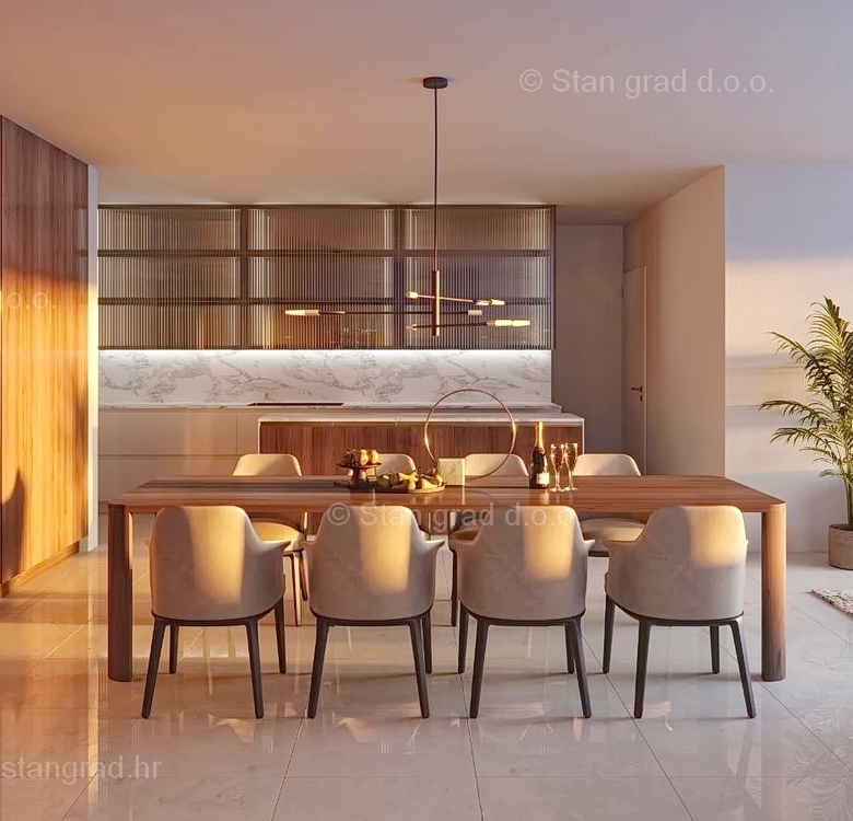 In the real estate offer of the Stan Grad Immobilien agency, on the island of Krk, there is a very attractive apartment perfect for a tourist stay and vacation or living on the Adriatic. The prominent apartment is located in the vicinity of Punt, right next to the sea. In nature, it is a very spacious and comfortable one-story apartment. In a building with an avant-garde look and quality, the apartment is located on the 2nd floor. The apartment has a total area of approximately 100 m2. This area includes the entrance hall, 2 bathrooms, 3 bedrooms, one of which has its own bathroom and access to the terrace, kitchen with dining room and living room with access to a large covered terrace. The apartment also has a roof terrace of 110 m2 with a swimming pool. The owner of the apartment can use all the common parts and spaces of the property without hindrance. The owner of the apartment will have one parking space at his disposal. In addition to the previously mentioned characteristics, the apartment has an excellent location and orientation, which provide its residents with a wonderful open view of the sea. This apartment is subject to VAT. The real estate seller guarantees a quick transfer of ownership rights and proper ownership and technical documentation. Contact us by phone, e-mail or in person at the address of our Kvarner office on the island of Krk. In addition to a professional tour and presentation of the property and its legal status, the friendly staff of our agency will be happy to help the buyer of the property in the transfer of ownership rights and the transfer of utility bills to their name.