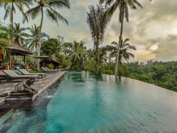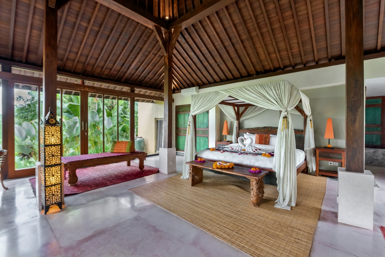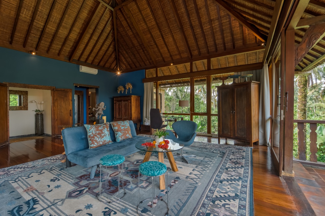 The living and dining areas of this west facing estate can be found in a beautifully carved teak wood Joglo overlooking the 12m x 5m infinity pool and the valley and jungle views beyond. The property has 4 private ensuite cottage suites – each offering a distinctive ambience. One of the cottages is a rare heritage gladak, exquisitely updated for contemporary comfort. Originally built in 1863, its sturdy teak walls and hand-tooled beams were once the foundation of a Balinese home. Another cottage suite is an airy abode beautifully accented with hand-carved teak. Soft lights draw your gaze upward to vaulted rafters inspired by the traditional Balinese home.
