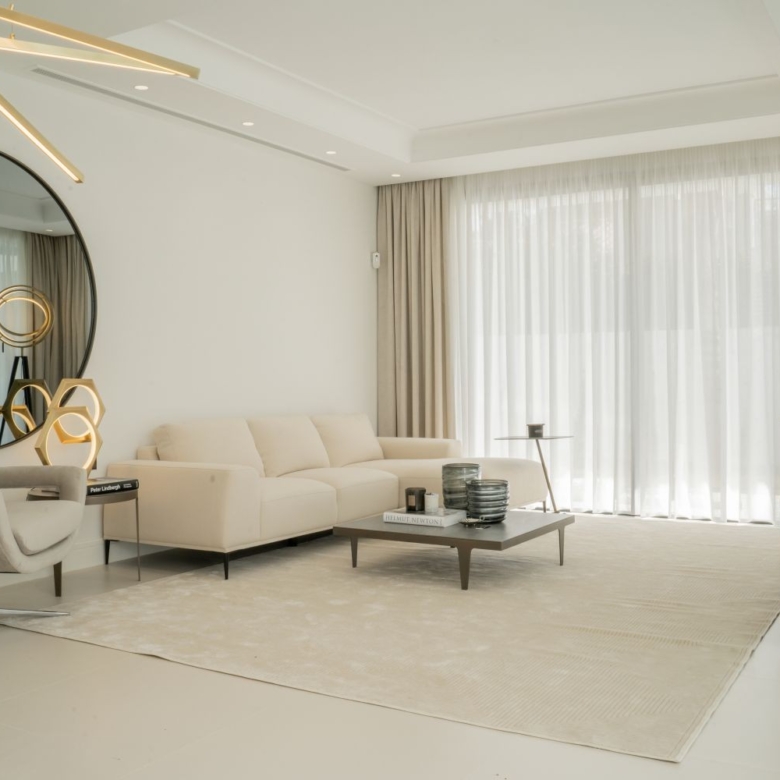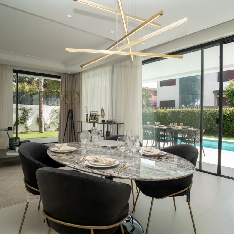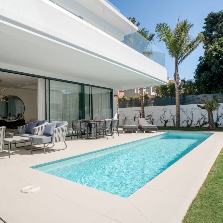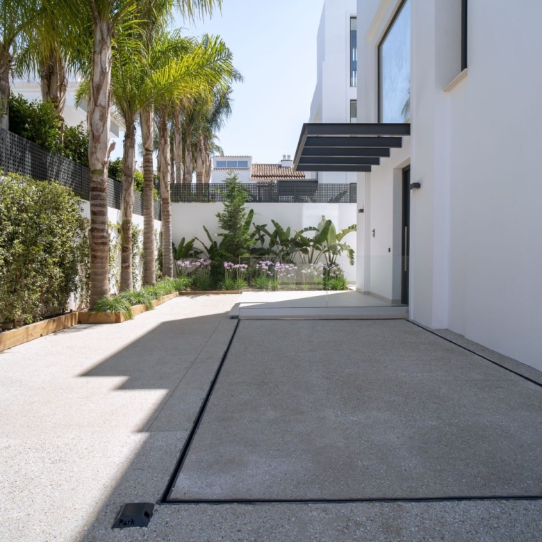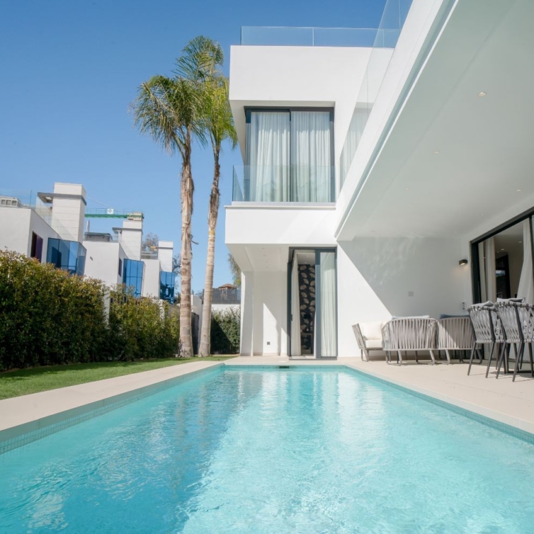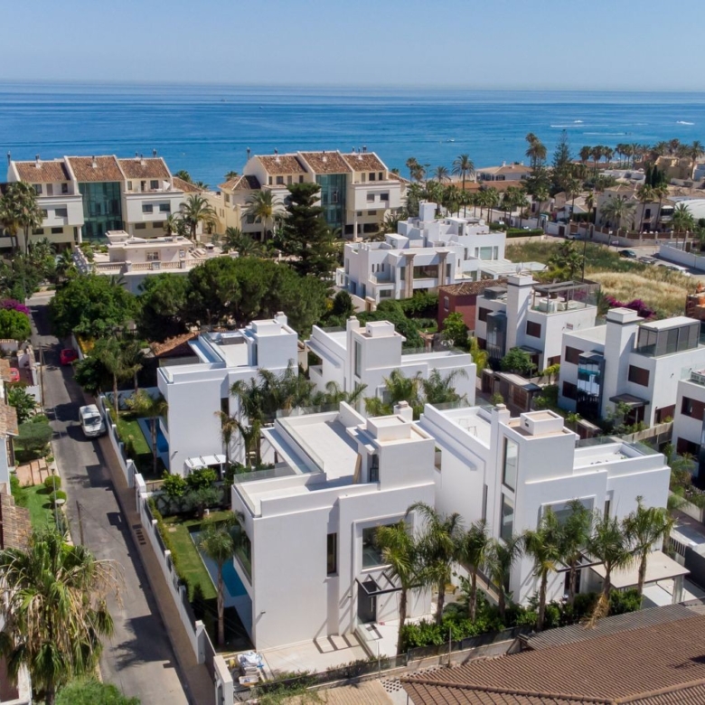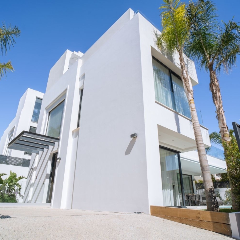 These marvelous new modern villas for sale are located in one of the most luxurious residential areas in Marbella – Golden Mile, in a secure urbanization Rio Verde, just 100 meters from the beach. The villas combine excellent quality, amazing location and the best price. Each house is spacious, full of light and equipped with everything necessary for a comfortable life. It consists of 4 bedrooms and 5 bathrooms, as well as large terraces on each floor, both covered and uncovered, perfect for barbecue, gatherings with friends or just sunbathing to your heart’s content. A private swimming pool will bring joy to your whole family throughout long Spanish summer. These villas in the Golden Mile are located close to the beach, three minute walk away from Puerto Banus and within a walking distance from the supermarkets. The villas offer beautiful sea views and are the perfect choice both as a holiday residence and as a family home.