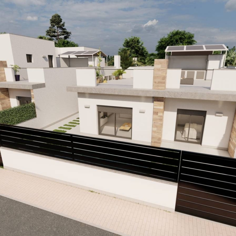 Single-family villas in Roldan, Murcia, Costa Calida A luxury complex of single-family homes with a private pool, terrace areas and solarium that allows you to enjoy all hours of sunshine, every day of the year. Each house has 2 or 3 bedrooms and 2 full bathrooms. The house has been designed on one or two levels, depending on the number of bedrooms, with a contemporary style and an open house concept, which is made up of a fitted kitchen and a living-dining room. The promotion is located in Roldan (Murcia), within a new gated community with security control in a partial plan of 300,000 m2, surrounded by all services, sports areas and several golf courses. The house has the highest quality standards and is equipped with: Private pool with pre-installation for heat pump and outdoor solar shower.Fully furnished and equipped kitchen with oven, microwave, refrigerator, built-in dishwasher and extractor fan. In addition, central wooden island.Lighting: LED inside the house, as well as in outdoor areas.Cabinets lined with drawers.Fully equipped bathrooms with furniture, sink, mirror with light, screens, wall-hung toilet and shower with ‘rain’ sprayer.Summer kitchen in solarium.Pre-installed air conditioning ducts.Parking space within the plot. Property ID: GH-307352 Price: €261,500 Property Size: 75 m2 Land Area: 100 m2 Bedrooms: 2 Bathrooms: 2 Property Type: Villa Property Status: For Sale