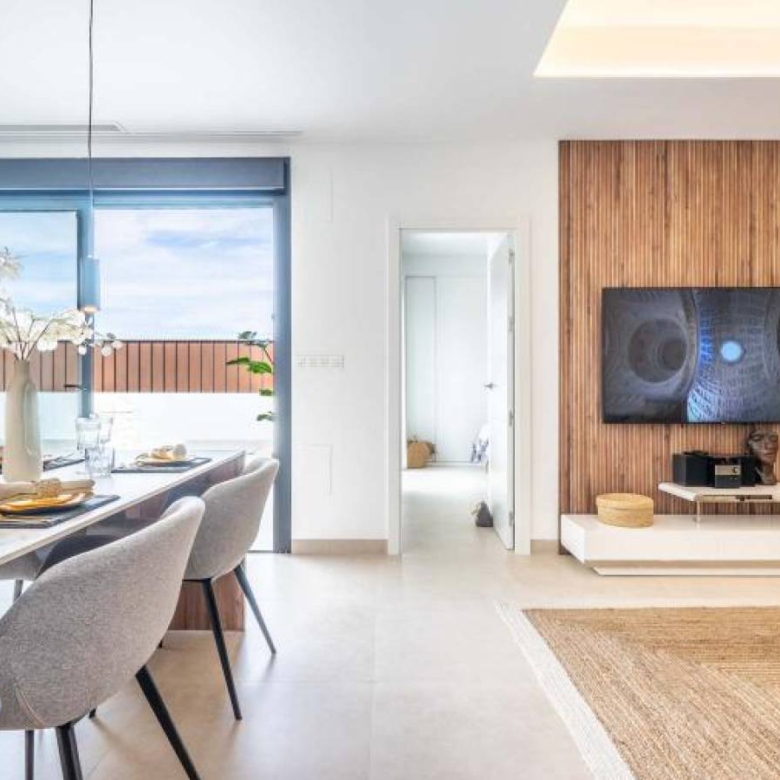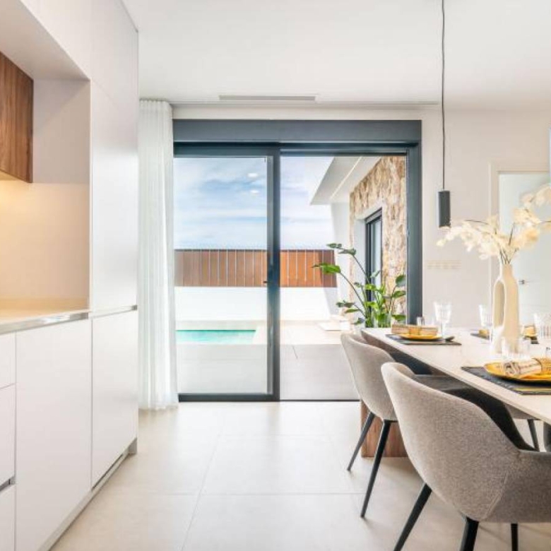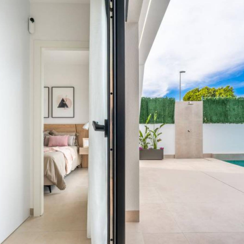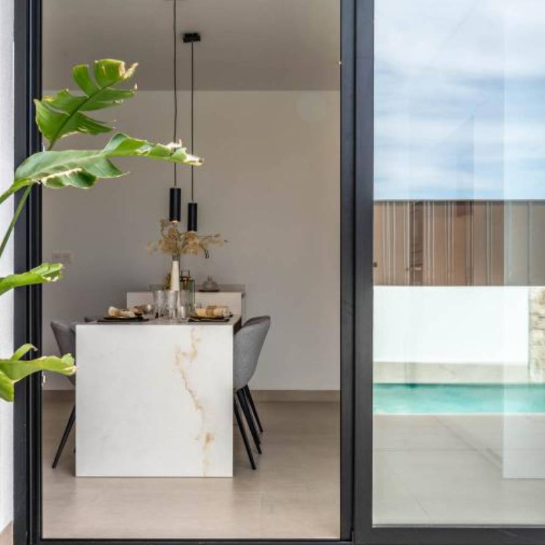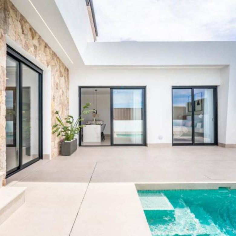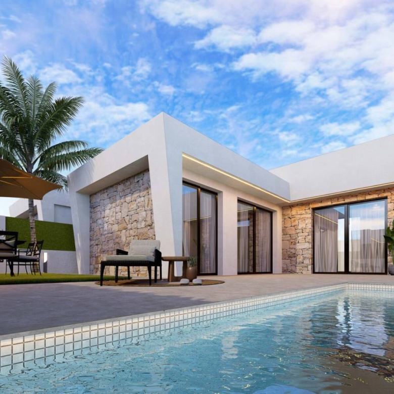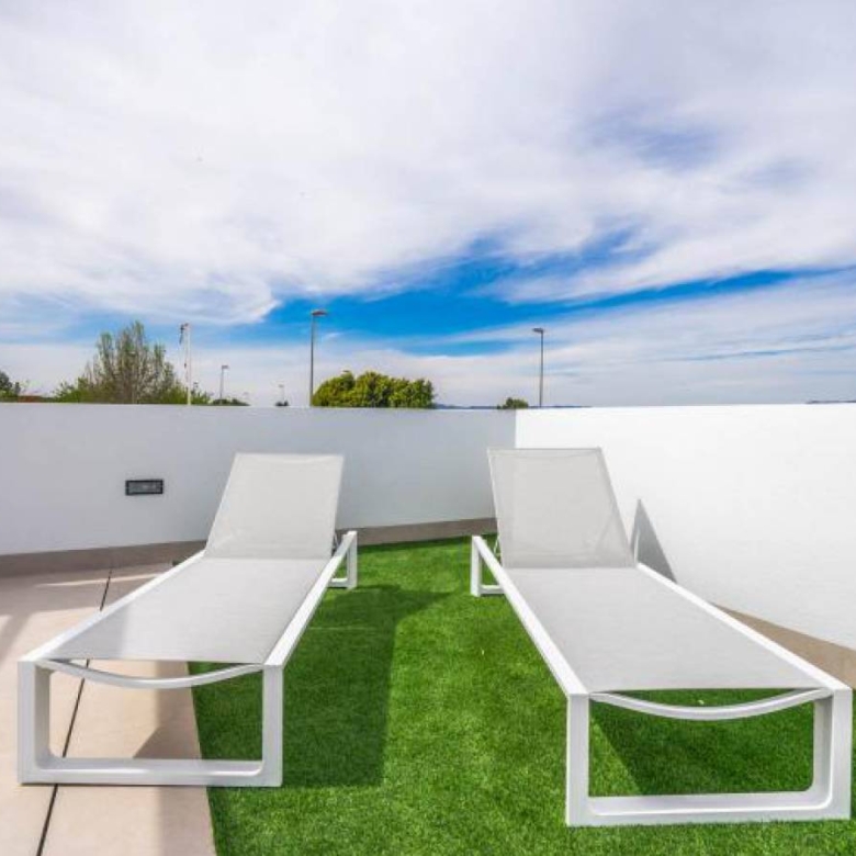 One floor villas in Roldan, Murcia, Costa Calida The villas are designed on one level with a raised ceiling to the kitchen area, each property has a wrap around terrace/sunbathing area on the ground floor and a large private solarium on the first floor to enjoy hours of sunshine all year round. They have stone walls, private rear swimming pool, large roof solarium, storage room and parking space within the plot. Each property has 3 bedrooms (master bedroom en-suite) and separate family bathroom with a contemporary ‘eco’ style and an open plan concept, comprising of a fitted kitchen and living/dining room, a storage room to the front and a private summer patio. Equipped with private rear swimming pool with outdoor shower, solarium, terrace areas, fully fitted kitchen and bathrooms with LED mirror, lined wardrobes with drawers, interior/exterior lighting, pre-installed air conditioning. The residential is located in a residential area of Roldan, surrounded by services, parks, sports facilities, two Golf Courses and only 12 minutes from the stunning beaches of the Mediterranean and the Mar Menor. Property ID: GH-307783 Price: €315,950 Property Size: 100 m2 Land Area: 200 m2 Bedrooms: 3 Bathrooms: 2 Property Type: Villa Property Status: For Sale