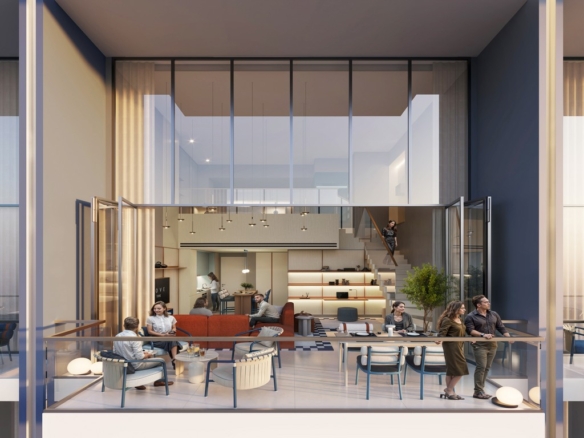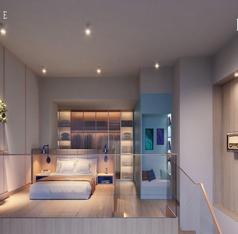 Sky Lofts provide double-height ceilings, floating beds, and panoramic Marina views