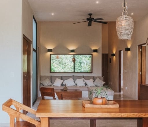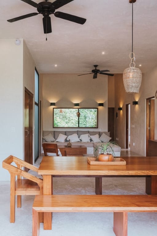 This 5,231-square-foot penthouse showcases a contemporary architectural design that harmonizes effortlessly with Tulum’s lush surroundings. The residence features alternating double-height ceilings, floor-to-ceiling windows, and artisan-crafted decor that enhances the luxurious ambiance. The spacious open-concept living area is adorned with custom L-shaped sofas, hand-made furniture, and natural finishes, creating a refined yet inviting atmosphere. Each of the five bedrooms boasts en-suite bathrooms and panoramic jungle views, ensuring tranquility and comfort. The flexible lock-off system allows the penthouse to be used as a three-bedroom and a two-bedroom unit, offering enhanced privacy and versatility. The King Suite features a private balcony and an open-air rain shower, immersing you in the beauty of nature while maintaining absolute seclusion.
