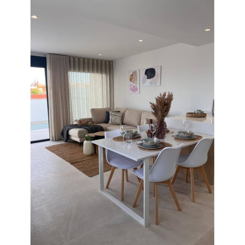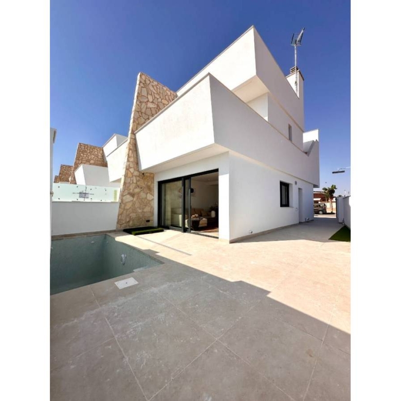Semi-detached villas in San Javier, Costa Calida The properties offer 3 generously sized bedrooms (first floor with en-suite bathroom) and a further bathroom on the ground floor with walk-in shower. The ground floor living area has a fully fitted kitchen with drop down table, open plan lounge/dining area, fully equipped kitchen area with white goods, outside storage room and terrace areas to the side of the villa, from the master bedroom and from the lounge area. Only a couple of minutes walk to the beaches of San Javier and only 5 minutes to the centre. All designed to provide the best open plan living space, with double sliding glass doors opening directly onto a large terrace with private pool, terrace and parking area. Perfect for leisure: Miles and miles of walking to explore:. This really is an amazing place to stroll around either day or night, with countless restaurants to choose from and some great little tapas bars by the sea. This area offers a great variety of sporting activities, including seasonal water sports: With some particularly good golf courses close by! Property ID: GH-307803 Price: €319,950 Property Size: 94 m2 Land Area: 120 m2 Bedrooms: 3 Bathrooms: 2 Property Type: Villa Property Status: For Sale
