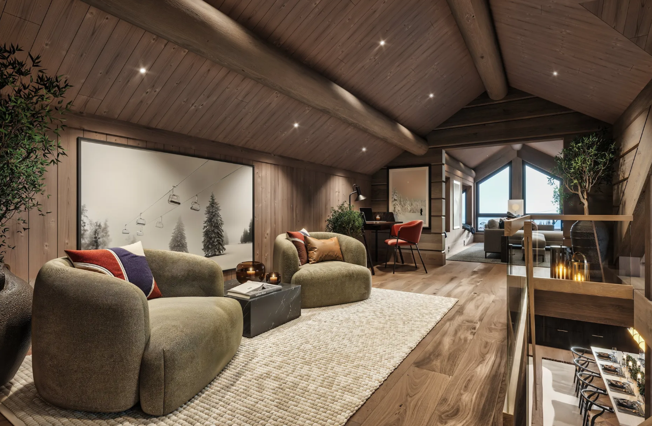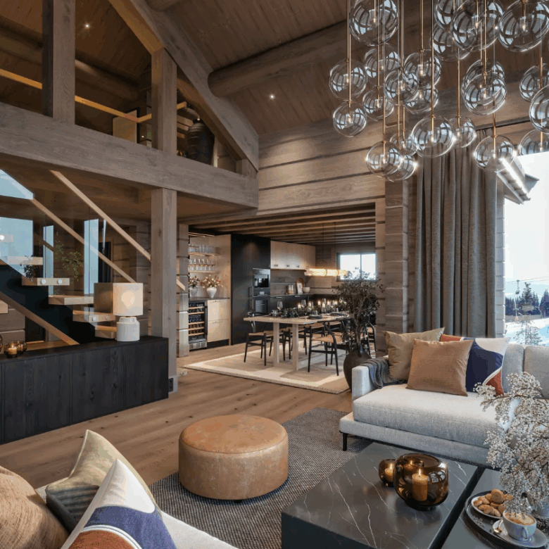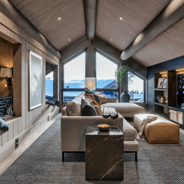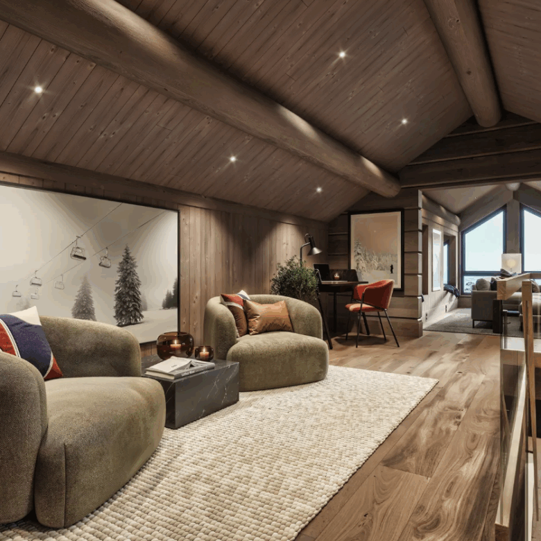This beautifully designed Scandinavian cabin (136.6 m²) represents the perfect blend of modern living and traditional alpine style. Featuring three spacious bedrooms, two stylish bathrooms, a cosy loft lounge, and cleverly designed sleeping alcoves, the layout offers plenty of space for family and guests.