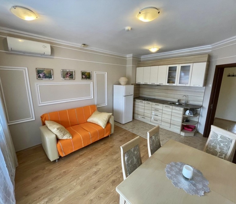 SEA and POOL VIEW 2 BED apartment, 85 sq.m., in Apollon 8, between Ravda and Nessebar We offer you a two-bedroom apartment in a gated development Apollon 8, located just 100 meters from the beach “Aurelia” equally close to the new part of Nessebar and Ravda resort. The apartment is on the 6th – top floor. It occupies a total area of 85 Sq M, The apartment offers spacious living room with a kitchenette, two bedrooms, 2 bathrooms, and a big terrace overlooking the pool and the sea. The kitchen is fully equipped, there is a dining table and chairs; the living room has sofa and TV. The apartment is sold fully furnished and equipped with air conditioning and wiring for cable TV. The annual maintenance fee of the complex is 10 Euro per Sq M. + VAT “APOLLON” is a closed complex surrounded by picturesquely designed spaces: public gardens with a variety of decorative vegetation, a childrens playground, a swimming pool for children and adults, an area for recreation and walking. Located between Ravda and Nessebar, just 200 meters from the beach and 300 meters from the Paradise Water Park. The Apollon complex consists of 10 five-story buildings, each of which has its own swimming pool with a childrens section and an extensive beach area. The location provides guests with two restaurants, a cafe, a minimarket, a small spa center, tennis courts, a childrens playground, and free parking. ✔ 7 swimming pools for adults and children ✔2 restaurants with full menus, dishes and drinks ✔3 playgrounds