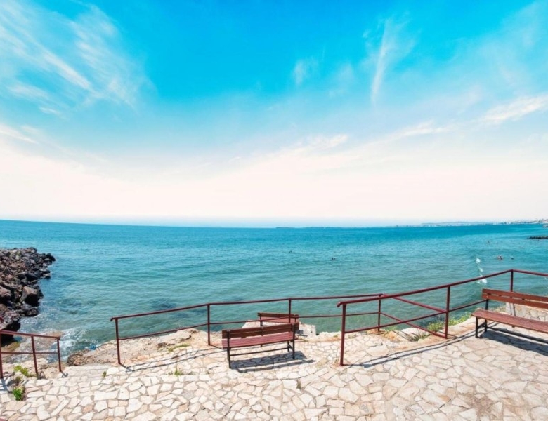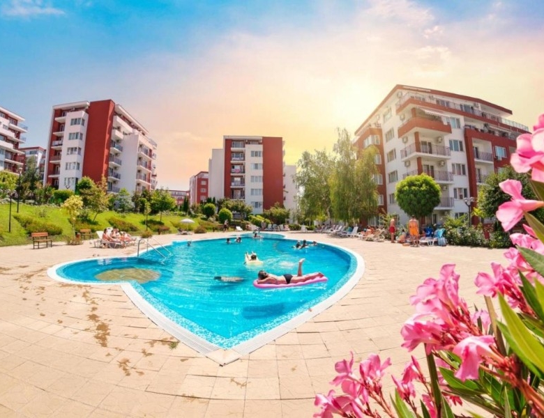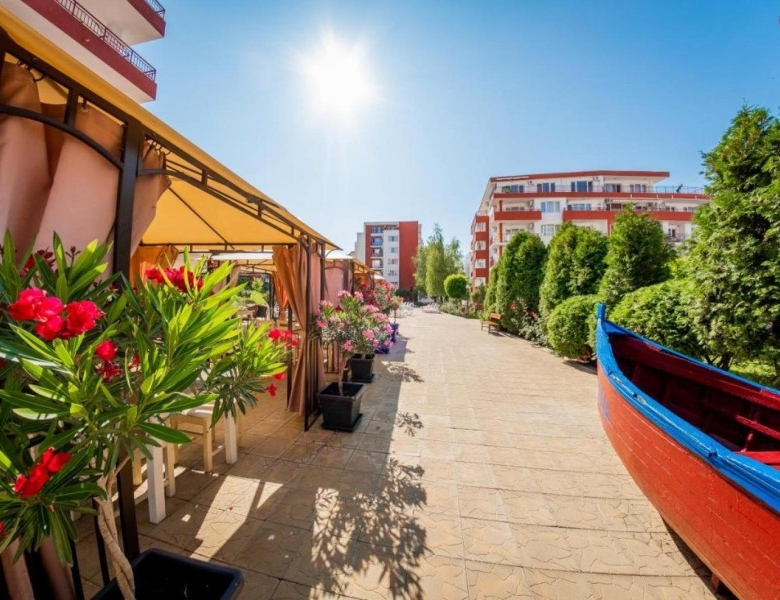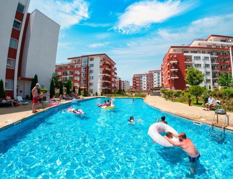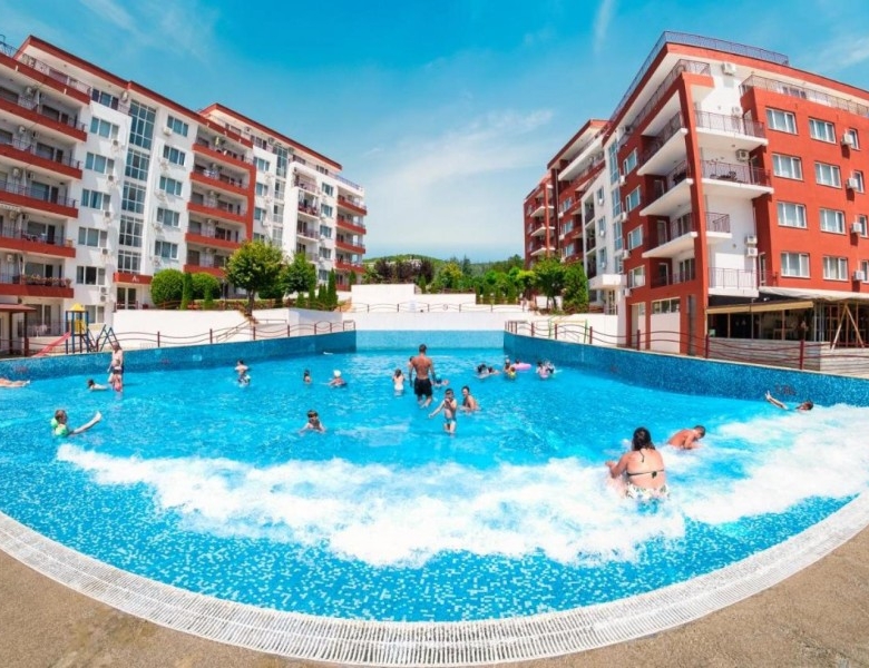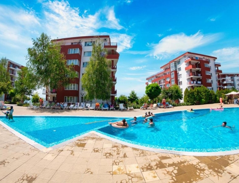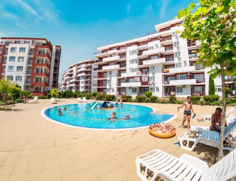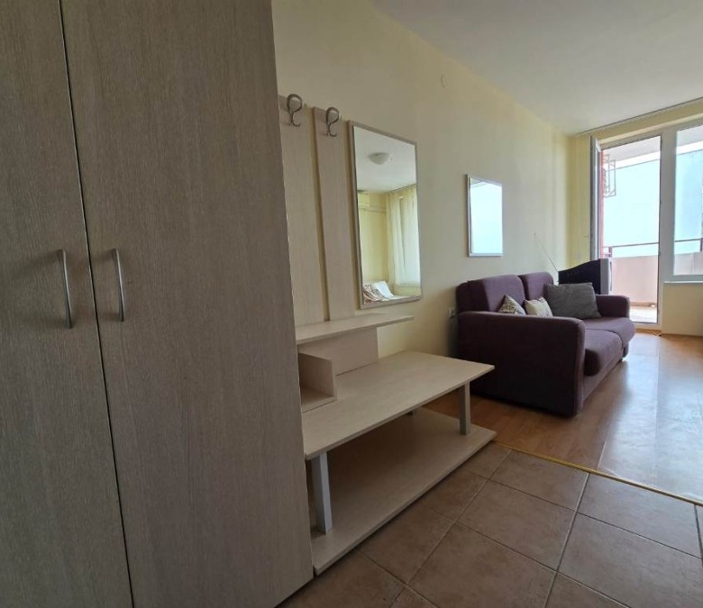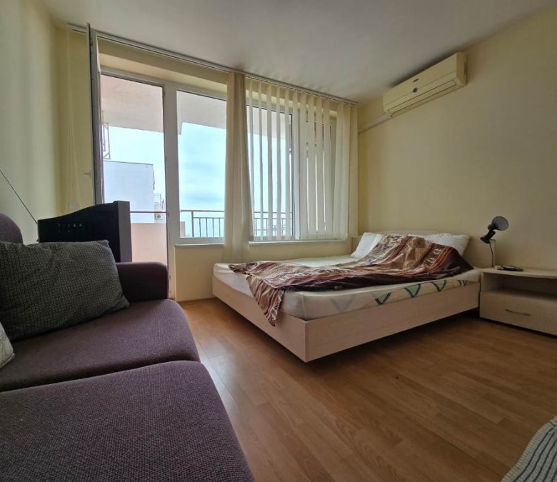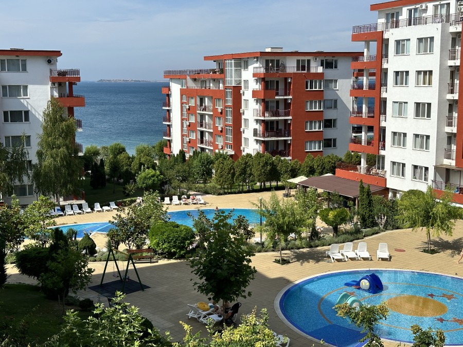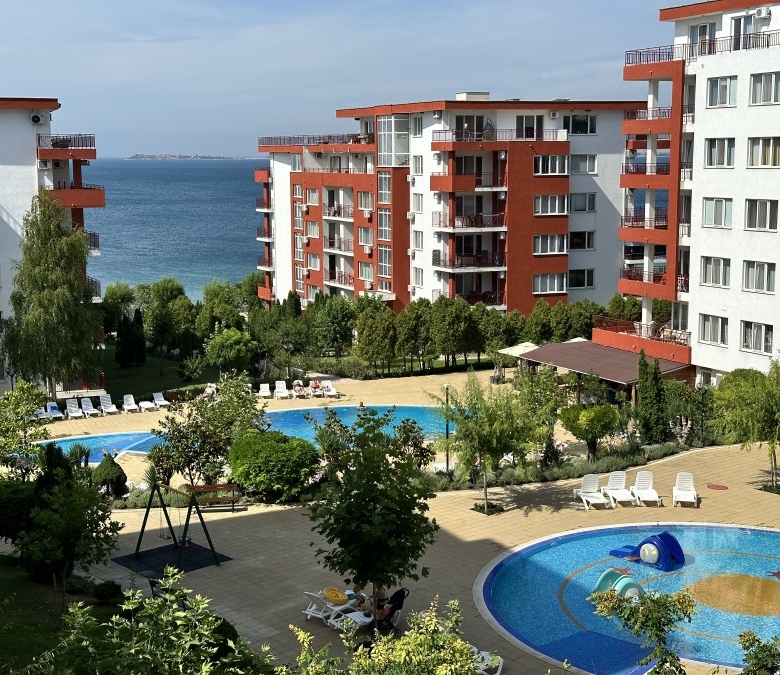 SEA VIEW studio, 33 m2, in Marina Fort, St. Vlas, first sea line Complex Marina View, St. Vlas First line Sea and Pool View Studio apartment Living size – 33 m2 Floor – 4th (elevator is operating all year round) For sale a SEA VIEW studio with furniture in one of the best complexes on the Bulgarian coast on the first line of the sea. Apartment with a very beautiful view of the sea, swimming pools and playgrounds, which is especially important for families with children. The studio is fully furnished and comprises of: – hallway; – kitchen with living-room; – bathroom and toilet – balcony with sea views; The complex is beautifully located – next to the sea, on a hill, surrounded by forest and offers the owners of apartments a beautiful view of the bay of Sunny Beach and the old town of Nessebar. Marina View is located on a hill, a wonderful combination of mountain and sea air, views of the sea and mountains. Complex is surrounded by forests, with the best infrastructure on the coast, which allows you to combine a variety of outdoor activities with relaxation. Onsite facilities and services include: – two restaurants with Bulgarian / European cuisine, a bar, an ice cream parlor – Three grocery stores and beach accessories stores; – sauna – Internet club and Wi-Fi coverage on site – SPA salon and Hamam – kids club – bicycles for rent – hairdresser – massage room – medical Center – exchange office – tourist agency – Car rent – home furniture and accessories store – playgrounds – guarded parking – 17 pools for children and adults, including pools with artificial waves and a jacuzzi. All pools are controlled by lifeguards for the safety of vacationers, free sun loungers. – two tennis courts, with lighting and the ability to play futsal – mini golf – billiards and table tennis, childrens computer games – huge landscaping areas make the complex cozy and conducive to a relaxing holiday. fitness room and outdoor exercise equipment Annual maintenance fee – 14.5 EUR/sq.m.