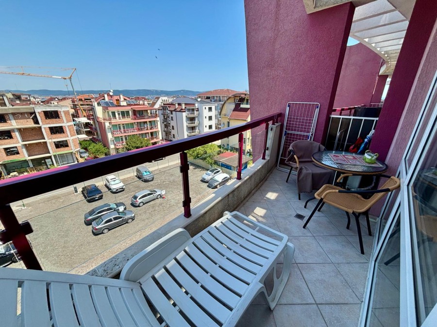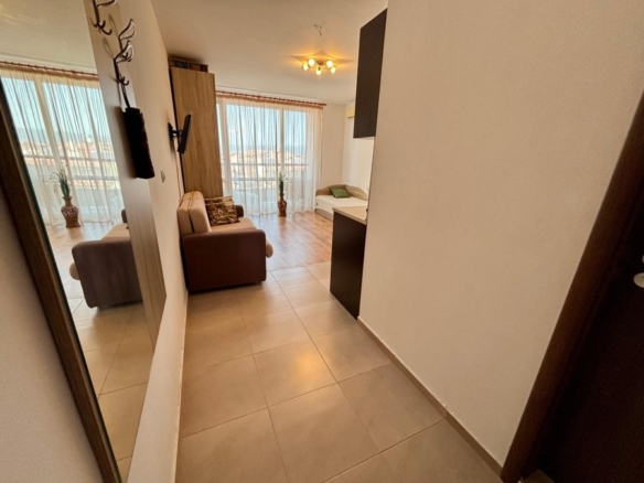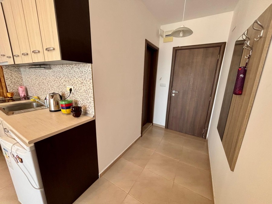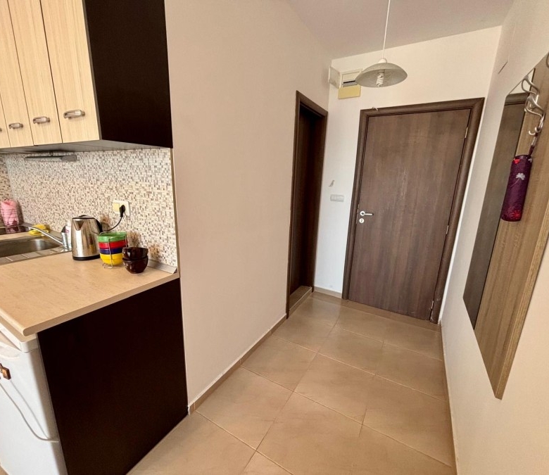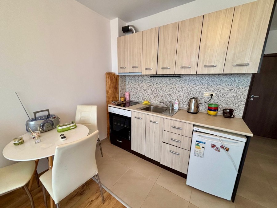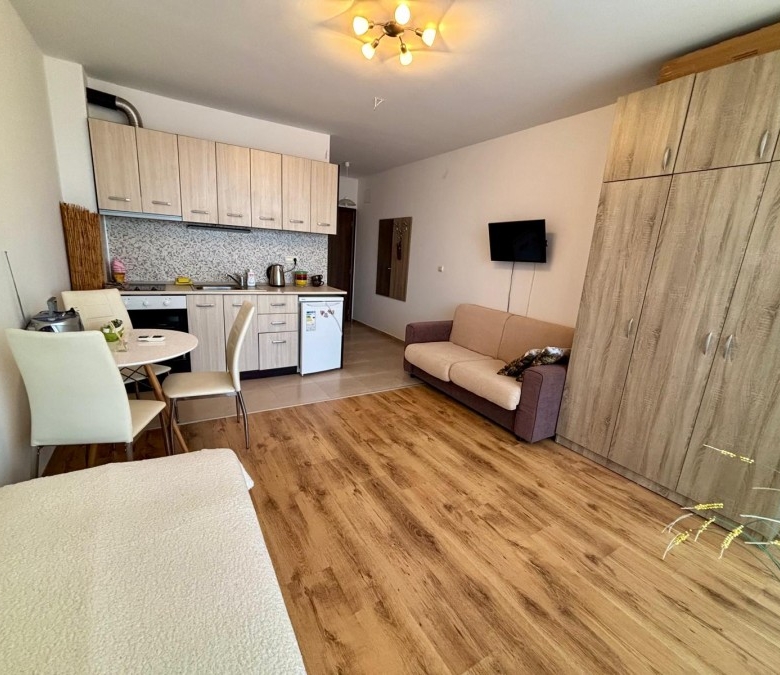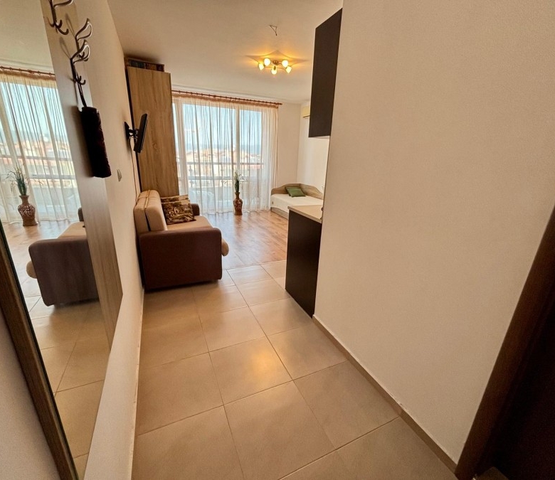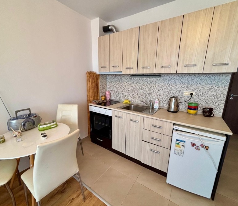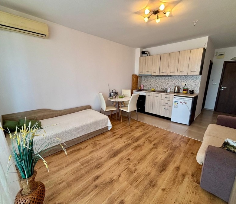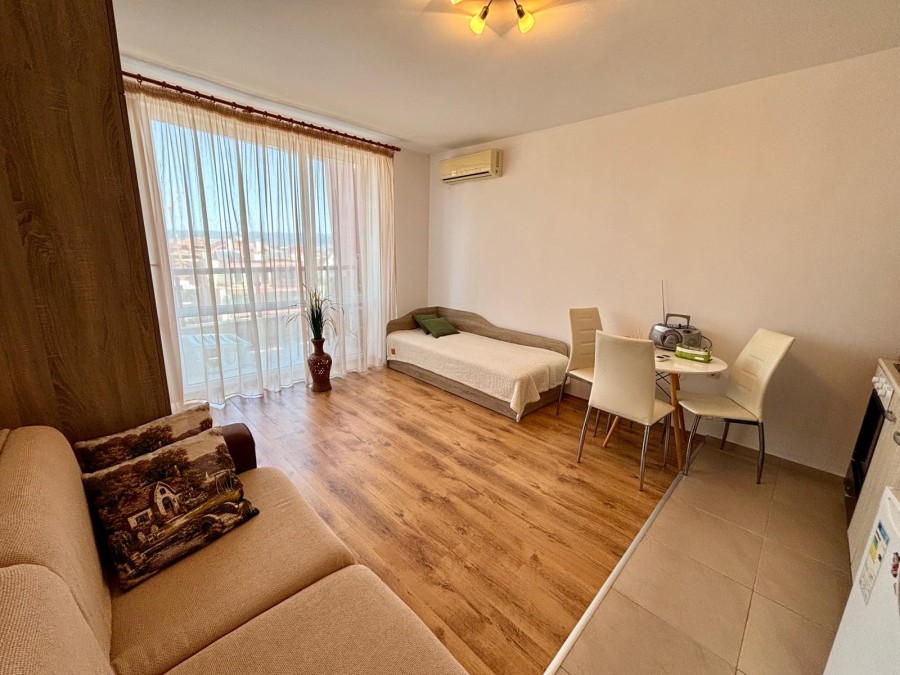 SEA VIEW studio, 39 sq.m., in Cabana beach, Nessebar, 200 m to the beach We are pleased to offer you this nicely furnished studio with attractive location – in the seaside town of Nessebar, just 200 m to the sandy beach. The property is part of Cabana beach – new residential complex quarter Cherno More, with Act 16, suitable for year-round residence. Total living area – 39 sq.m. The studio is situated on the 4th floor with a lift and comprises of: – entrance hallway; – kitchen with living-room; – spacious bathroom with shower cabin; – balcony with sea views. The studio is fully furnished and ready to use. Annual maintenance fee is 355 EUR Within short walking distance there are various shops, restaurants, pharmacy, bus stop, petrol station. Excellent location for year-roud-use and/or holiday rentals.