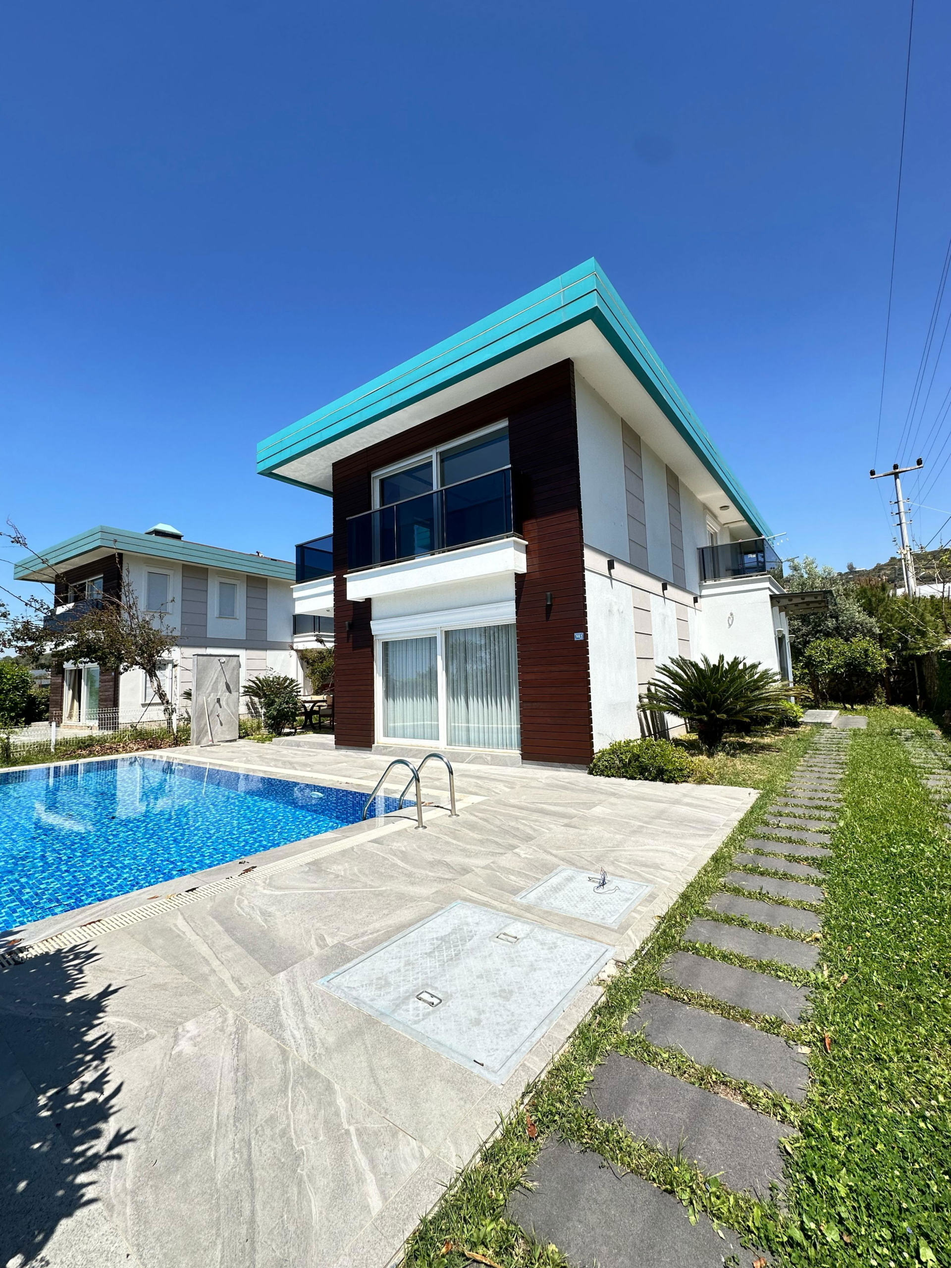 The villa’s architecture follows a modern-luxury line with clean façades, wide windows, and terraces that invite natural light. On its 350 m² plot, the house offers 180 m² of living area across two floors. A private pool framed by landscaped greenery forms the heart of the garden. Because the beach is just 150 metres away, you get the seaside lifestyle without the crowd directly outside your windows. Parking space and a camera system add everyday convenience and security.