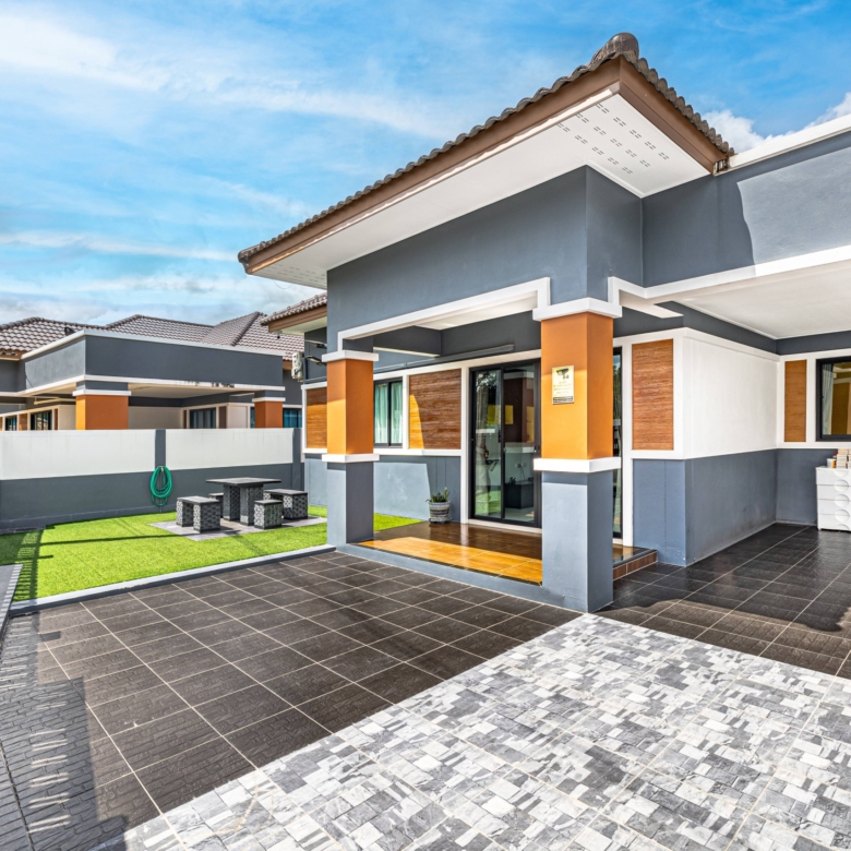 Exterior: The house features a front yard with a lawn and a seating area, complete with a marble table. On the side of the house, there’s an outdoor dining area suitable for gatherings with guests. At the back, there’s a spacious area for storage or laundry.