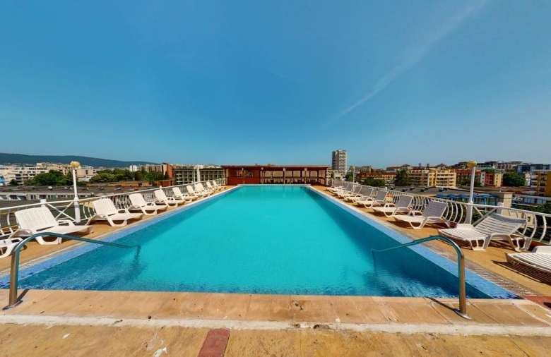 Spacious 2 BED apartment, 90 sq.m., in Barco del Sol – central part of Sunny beach We present you this very spacious, fully furnished apartment which has a total living area of 90 sq.m. and consists of: -Entrance hallway; -Kitchen – lounge area; – 2 Bedrooms; -Bathroom/WC; – separate toilet; -Balcony. The apartment is offered fully furnished and ready to use. Complex Barco del Sol is situated in the central part of Sunny beach, within short walking distance to many shops, restaurants, beach, Aqua Park. The apartment is situated on the 3rd floor In Barco del Sol – in the heart of Sunny beach resort. It has wonderful location – all the shopping facilities, restaurants, clubs, bus stop, bank office, medical center are within 100-150 m away. Annual maintenance fee – 9.6 EUR/sq.m. Act 16, separate accounts for water and electricity. Distance to the beach is 400 m and to Action Aqua park – 300 m. Another benefit of the property is that despite of its closeness to all attraction of the resort, it is set on a quiet street. There is a bus station just a few minutes away from the aparthotel thus you can get quick and convenient transportation to the neighboring resorts – St. Vlas and Nessebar. The biggest attraction of the aparthotel is its pool which is located on the roof. From there you can enjoy the scenic view while drinking a drink at the bar. On site facilities in Barco del Sol: – Lifts; * Swimming pool for adults on the roof of the building with open views to the whole resort * Area for lounges and recreation * Mini Market Sunny Beach – the biggest and most popular resort in Bulgaria which is located in the southern part of Black Sea coast. Sunny Beach is convenient for travelers arriving by plane , as Burgas airport is only 35 km . The Beach stretches for 8 kilometers and is 60 meters wide , the sand is fine and clean, golden color, forming dunes in some places . Holidays in Sunny Beach are suitable for families with young children: the entrance to the water is very shallow , the sea is calm , without the big waves, and sea water – clean .