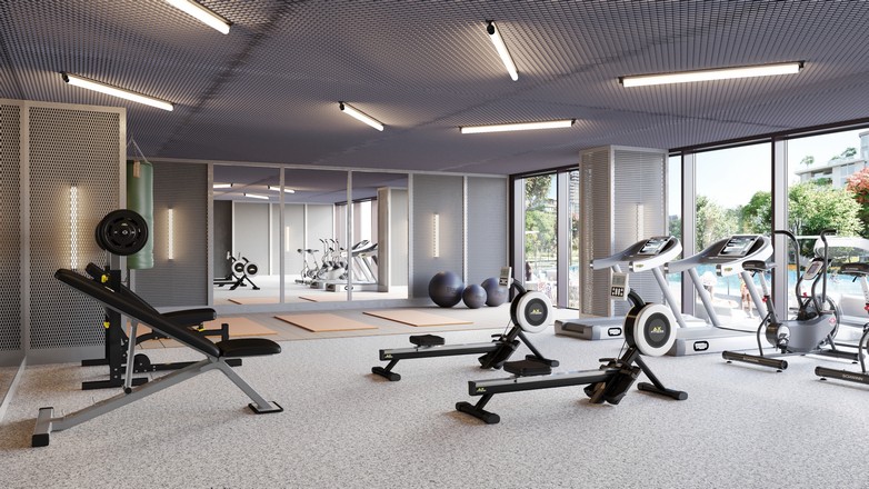 Outdoor gym, fitness stations, and a running track