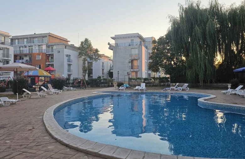 Spacious pool view 1 BED apartment, 62 sq.m., in Sunny Day 3 Premium, Sunny beach KC Properties would like to present you this elegantly furnished apartment which is ideal for renting out due to its convenient location. The apartment is situated within short walking distance to a number of supermarkets, shops, restaurants and attractions of Sunny beach resort. Distance to the beach is less than 10 min walking. The apartment is situated on the third floor and has a total living area of 62 sq.m. It comprises of: – hallway; – Open-plan kitchen with lounge area; – One bedroom; – Bathroom/WC; – Balcony with pool views. The apartment is tastefully furnished and offers small kitchen with cupboards, washing machine, fridge, dining table with 4 chairs, leather sofa-bed, double bed and wardrobe. Shower cabin in the bathroom. There is an A/C for heating and cooling the place. Small balcony looks to the swimming-pool of the complex and offers views to the surroundings. On site facilities include: – Outdoor swimming-pool with children’s section; – Snack-bar; – Children’s playground; – Parking; – Security; – Vegetable market. Annual maintenance fee – 580 EUR/year.
