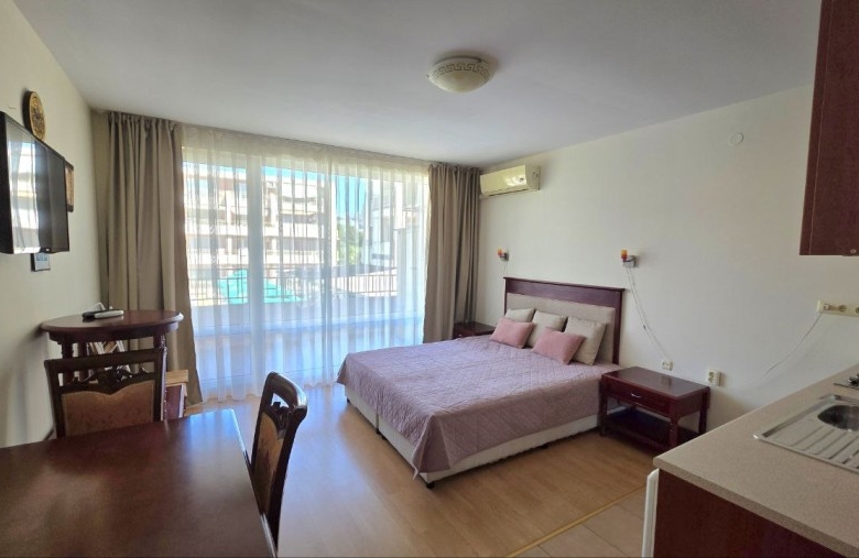 Spacious pool view studio, 41 sq.m., in Nessebar Fort Club, opposite the Aqua Park We are pleased to offer you this spacious studio in Sunny beach resort. The apartment is situated on the 2nd floor and has a total living area 41 sq.m. It comprises of: – Open-plan kitchen with dining-area and lounge; – Bathroom/ WC; – terrace with pool views The apartment is nicely furnished and offers everything necessary for comfortable stay. There is equipped kitchen with oven, fridge, washing machine, small utensils, dining set, double bed & air-conditioner. The bathroom is fully tiled and has a shower cabin. The apartment has a view to beautiful garden and to the swimming-pool. It is excellent property for permanent residence. Nessebar Fort Club is a well serviced complex situated opposite Aqua Park in Sunny beach, within 10 min walking distance to the sea. It has 5 pools, supermarket, 2 restaurants,sauna, Spa, gym, many outdoor sport facilities, golf course. Annual maintenance fee – 13.5 EUR/sq.m.