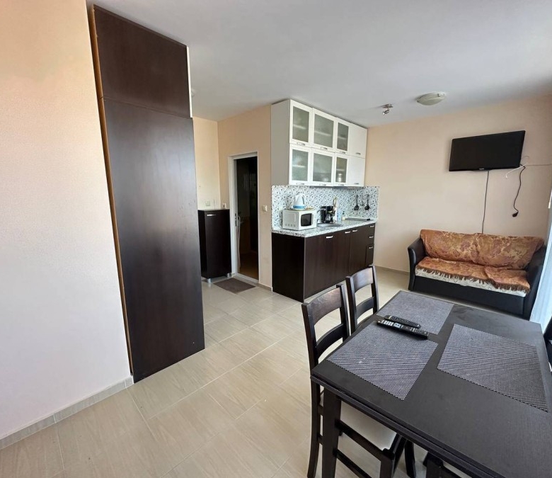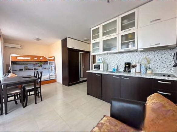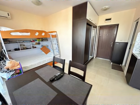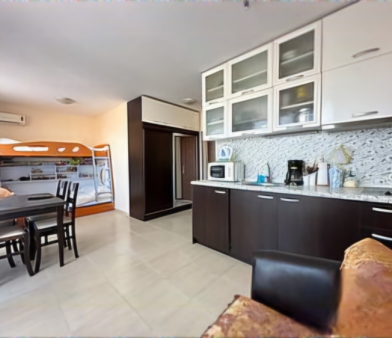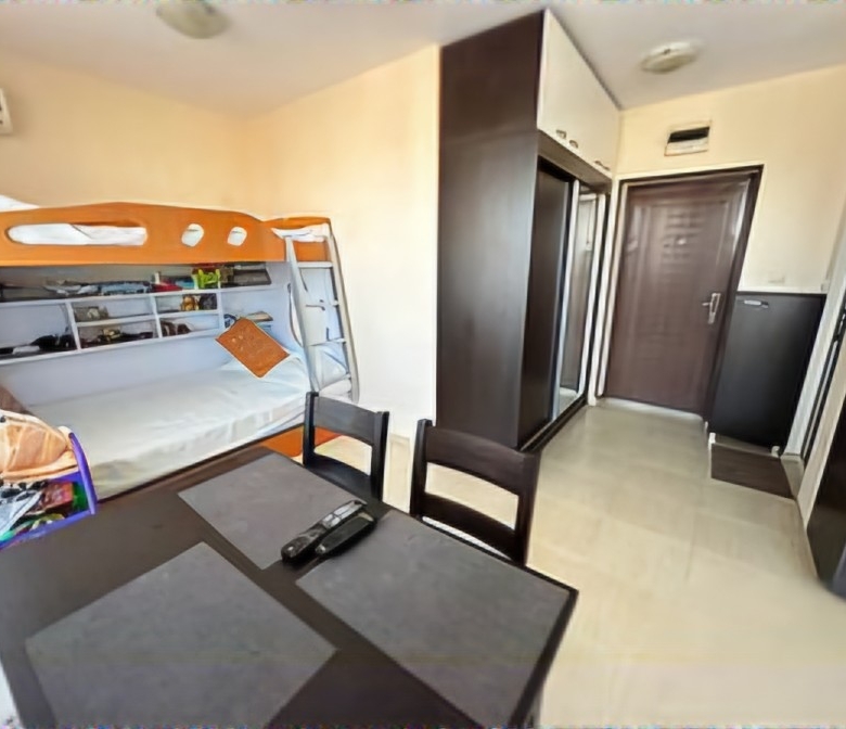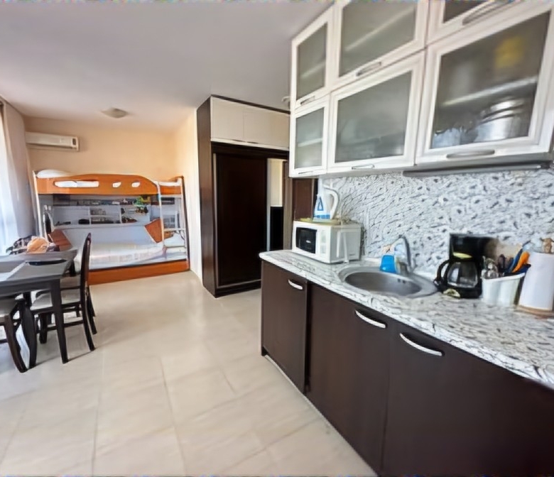 Spacious SEA VIEW studio, 48 sq.m., in Sunny Home 2, Sunny beach We offer for sale spacious studio with a big terrace and sea views in complex Sunny Home 2, in Sunny beach resort. The studio is situated on the 5th floor and has a total area of 48 sq.m. It comprises of: – hallway; – kitchen with dining area; – bedroom in a niche; – bathroom; – big terrace with views to the sea. *The layout of the studio makes it suitable for converting into 1 BED apartment. Sunny Home 2 is a cozy complex located in the central-western part of Sunny Beach, in a quiet area near a forest. In a closed area, the building is six stories high with two separate entrances and elevators. Apartments with a similar layout – studios and 1 bedroom – from 31 to 66 sq.m. with views of the forest or the pool. The building was put into operation – act 16. Facilities of the Sunny Home 2 complex – a swimming pool with a childrens section, a sun lounger area, a playground, a barbecue area, parking. Annual maintenance fee – 8 EUR/sq.m. Sand dunes start 200 meters from the complex. The beach strip is more than 4 km long with equipped places for sunbathing and relaxation, lifeguard stations, bars and restaurants right on the sand and many clothing and souvenir shops. In walking distance from the Sunny Home 2 complex and other infrastructure: supermarkets, pharmacy, beauty salons, school, kindergarten, parks, public transport and much more. The nearest airport is just 35 km from Sunny Beach.