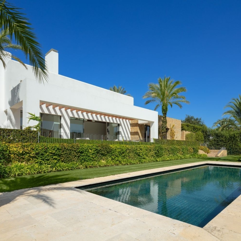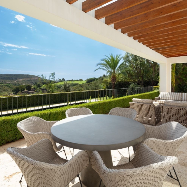 This spectacular villa is situated in Green 10 within the prestigious Finca Cortesin Resort. The villa sports stunning architecture that offers a modern take on golfside villas. Upon arrival, a private driveway leads to covered outdoor parking spaces for two cars. Spanning two floors, the ground level of the property unveils a striking living room adorned with high ceilings, creating a sense of openness. Bathed in natural light streaming through the expansive glass sliding doors and windows, the living area is divided into two distinct seating areas, elegantly separated by a charming fireplace. Adjacent to the living room, an exquisite dining area seamlessly connects to the fully equipped kitchen, which boasts state-of-the-art appliances and a pleasing neutral colour palette. With ample counter space and storage, this kitchen is a haven for aspiring chefs. Blurring the boundaries between indoors and outdoors, the entire ground floor provides direct access to the terrace. The garden level unfolds with spacious terraces designed for enchanting moments of dining and relaxation. Here, one can appreciate the meticulously manicured garden, private swimming pool and breathtaking views of the surrounding landscape and golf course. The villa offers two guest bedrooms on the ground floor, granting direct access to the garden, while the remaining bedrooms are nestled on the upper level. A captivating walkway connects the rooms, serving as an interior balcony that overlooks the living area, with skylights infusing the space with natural light. Each bedroom enjoys access to the upper level garden area that envelops the property, along with a private bathroom. The opulent master bedroom, generously proportioned and meticulously designed, offers pristine views that add to its allure. With its enviable location, thoughtfully crafted layout and uninterrupted views, this villa epitomises the pinnacle of luxury living within a golfing paradise.