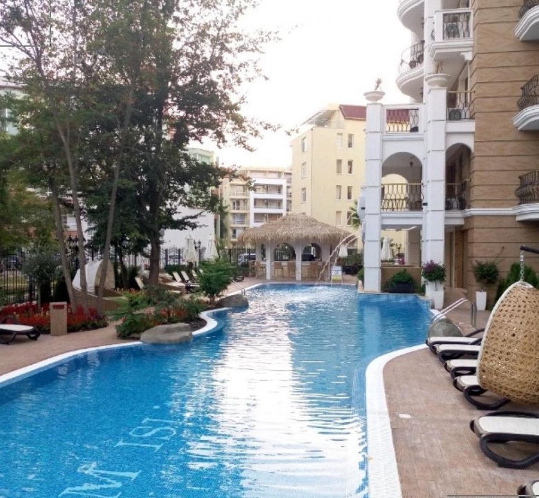 Studio apartment, 32 sq.m. in top class Harmony Suites 8-9 (Dream Island), Sunny beach We are glad to offer this luxury holiday complex “Harmony Suits 8 and 9 – Dream Island” in the biggest Bulgarian seaside resort – Sunny Beach. As all other predecessors, the modern apart hotel complex offers all-season pleasure in harmony with pure nature, comfort and warmth in the complexs original architecture. The complex offers high level of security, features an individual architectural style and comfortable living conditions. We offer a nicely furnished studio apartment on the 2nd floor with views to the garden. Living area – 32 sq.m. The apartment is completely furnished to an excellent standard and comprises of: – entrance hallway; – kitchen with living-room; – bathroom and toilet; – balcony with views to the garden. 800 m to the beach Maintenance fee – 20.4 EUR/sq.m. Dream Island is located near the Pine Grove Park and near the operating complexes Harmony Suites 1, 2, 3, and Harmony Suites 4, 5, 6 Monte Carlo. Proximity to the sea, parks and infrastructure makes this place attractive and comfortable for living and recreation. Harmony 8/9 offers many services to its owners and guests. One of the best advantages is the park near it. It provides quiet place for relaxing rest with children’s playground. Harmony Suites Spa & Wellness Club gives you a personal club card for using all the facilities in all complexes Harmony Suites and Harmony Palace. There are modern outdoor pools with hydrolysis and electrolysis system for water cleaning. Here is a full list of all other facilities: * Big green Pine park * 30 meter swimming pool for adults and children’s pool * Reception/Lobby * Chill out pool bar * Outdoor fitness center * Volleyball playground * Children’s playground * Outdoor Jacuzzi * Laundry * WI-FI * Satellite TV * Intercom * 24/7 Security and cameras The complex is beautifully designed. You can relax and unwind in the lobby bar, watching the flowing waterfall and a creatively designed pool resembling a river with islands.