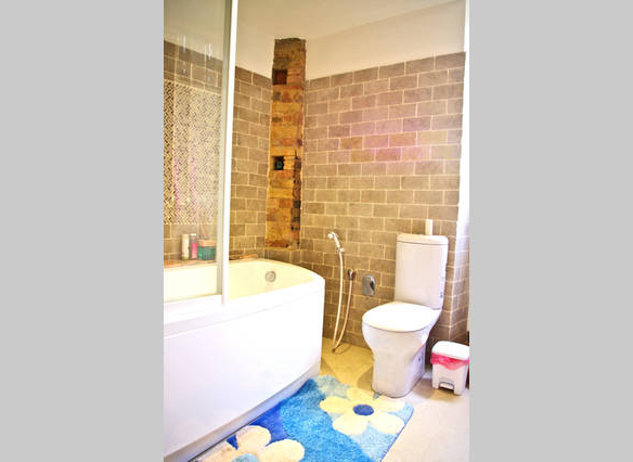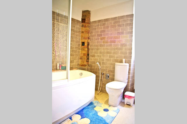 The 60-square-meter studio apartment has been thoughtfully designed to offer a comfortable and stylish living experience. The open-plan layout creates a spacious and airy feel, while the loft bedroom with its antique round windows provides a unique and romantic touch. There is also a Jacuzzi bath in the bathroom.