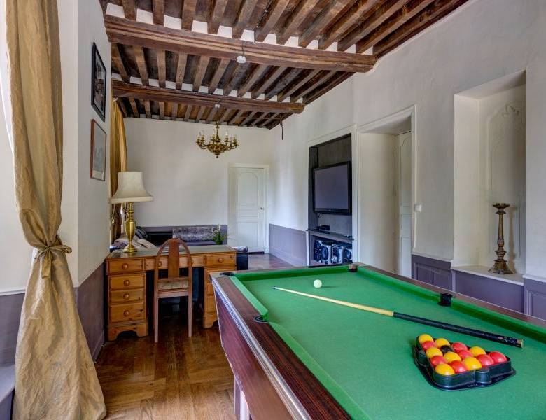 The chateau is equipped with six bedrooms consisting of four double rooms, one twin room and one family room which sleeps 4 people (two singles and one double bed). There are six bathrooms, some of which are en-suite. The ground floor level offers a large kitchen-diner with working fireplace, a large lounge, a TV lounge equipped with Sky, DVD and video, a billiards table, a separate dining room, a utility room / second kitchen area, a lavatory and the two beautiful staircases which lead to the upper levels.