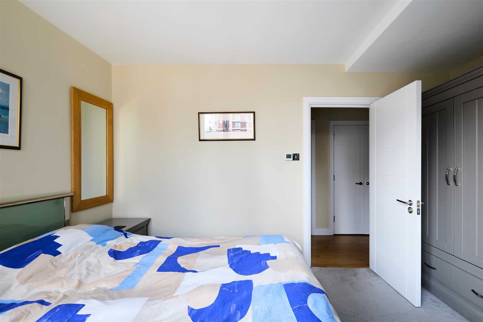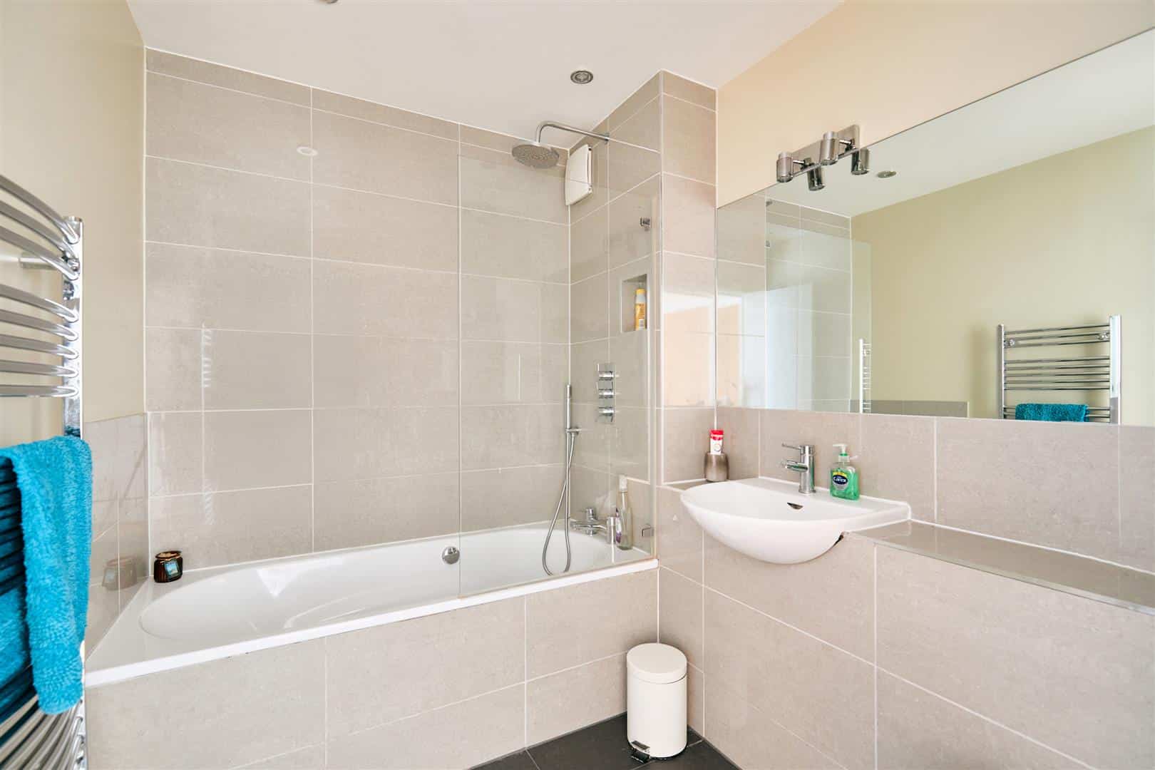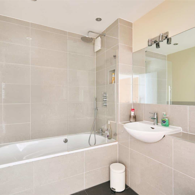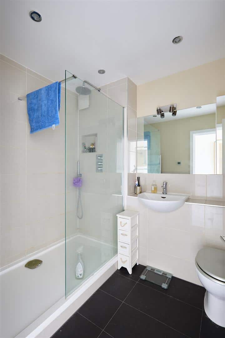 The second bedroom is generously proportioned and enjoys an abundance of natural light, courtesy of a charming Juliet balcony that overlooks the surrounding development. This bright and airy room is perfectly complemented by a stylish and contemporary family bathroom, featuring high-quality fixtures and fittings.