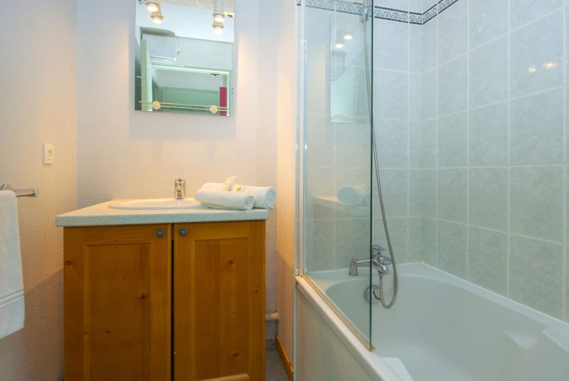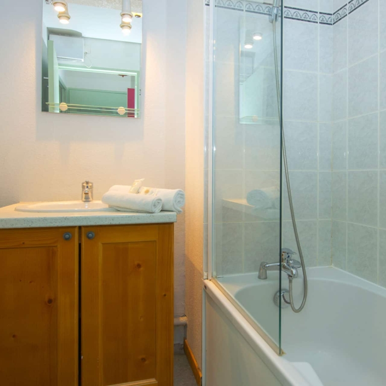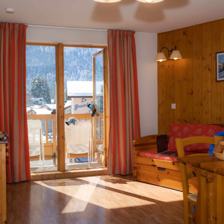 The apartment is on the ground floor (RDC) but there is another floor below it due to the sloping ground, and so it feels like a first-floor apartment. It is one of the nicer 2-bed apartments being at the edge of the development and on a corner of the building with a balcony facing the East/South-East mountain (nice morning sun), and a window facing the second aspect of mountains.