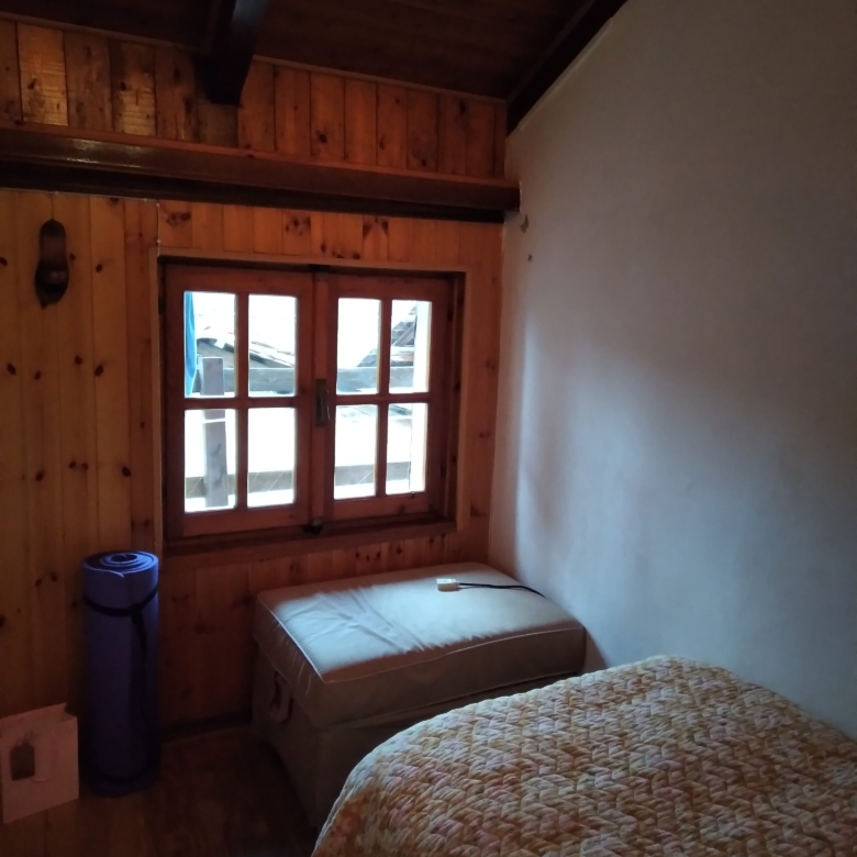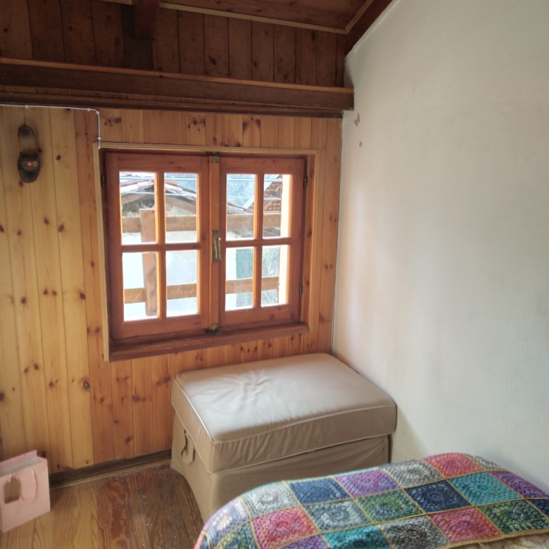 The double bedroom faces the narrow streets where the alpine cows can be heard passing with their cowbells. All the furniture is built in. The mattress was bought seven months ago.