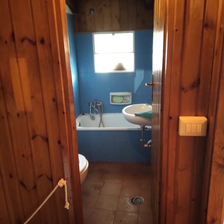 The bathroom is typical of alpine chalets. There is a sink, toilet and sit-down bath with a shower head for rinsing. There is a lit bathroom mirror along with the central light.