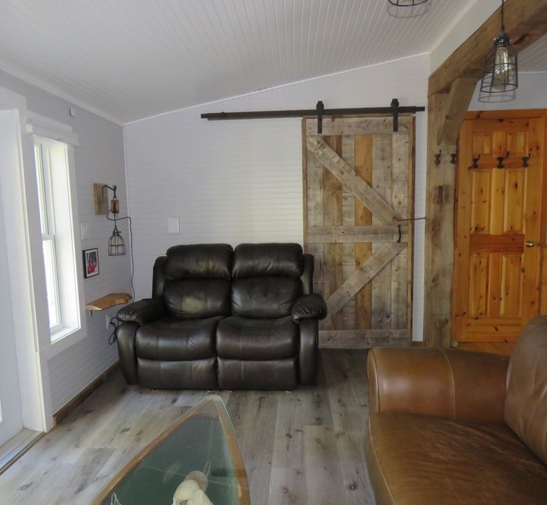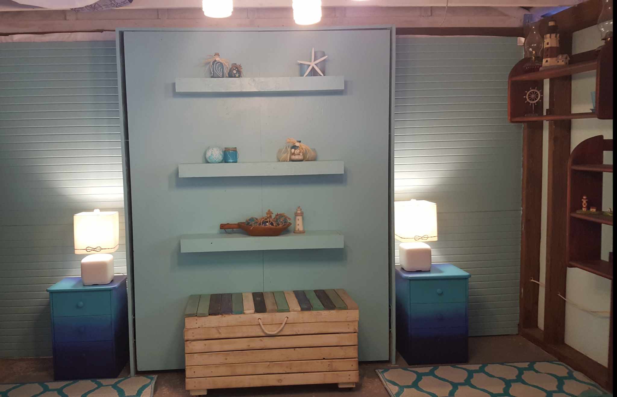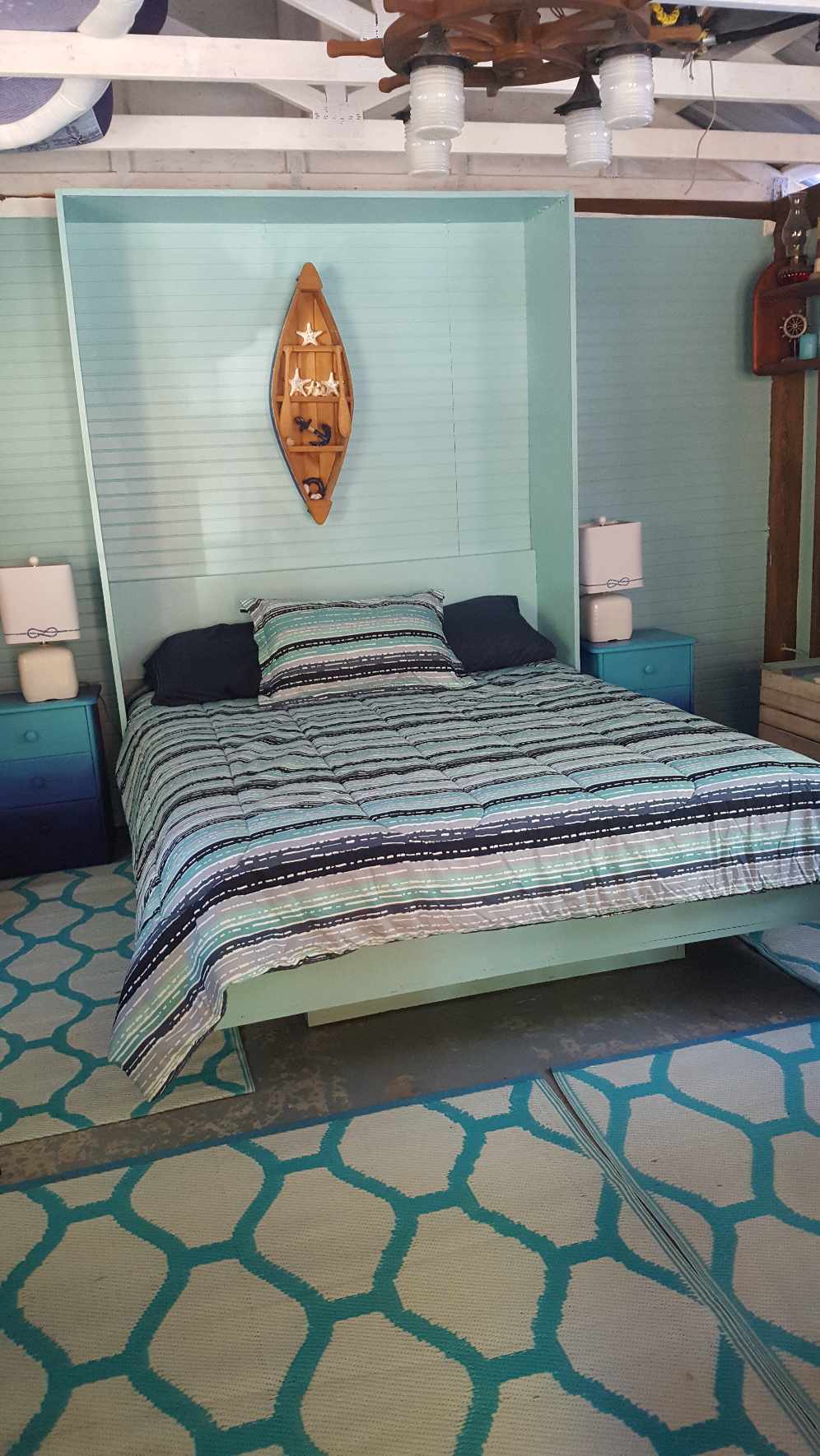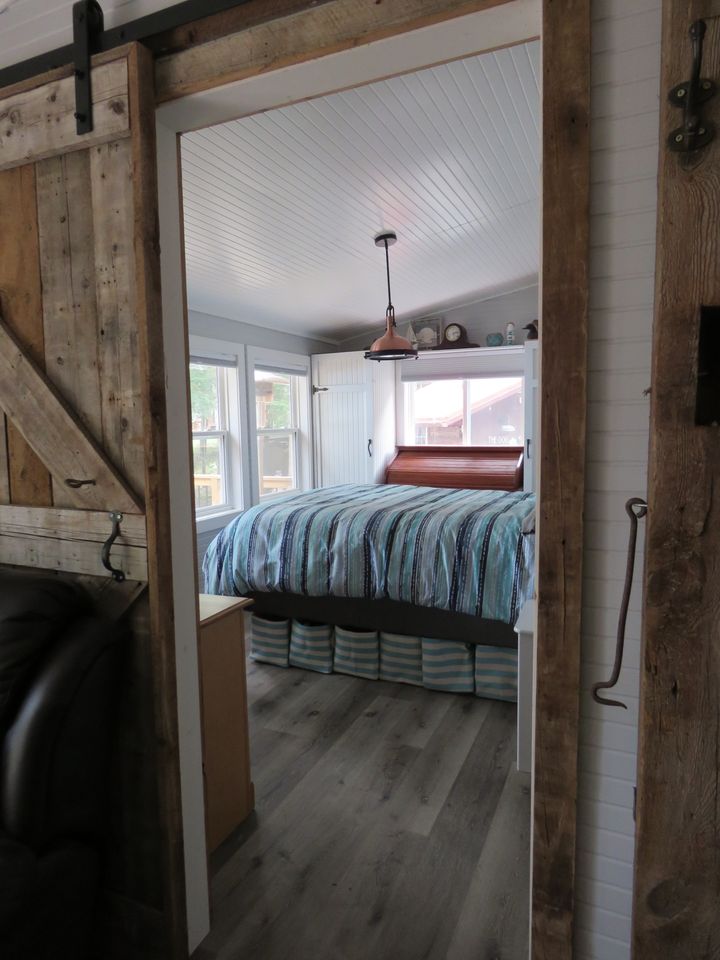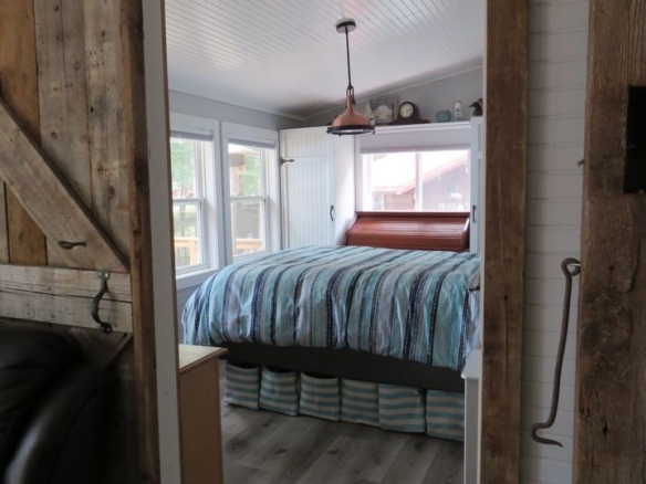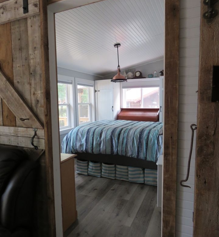 Three season, 200 sq. ft. bunkie with 6×16 pressure treated deck across the front. French doors, large windows, and an open beam ceiling make this area spacious and bright. A queen size Murphy bed keeps the bunkie versatile in use for guests’ sleeping area and as a man-cave or she-shed.
