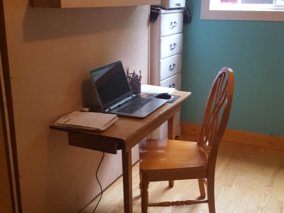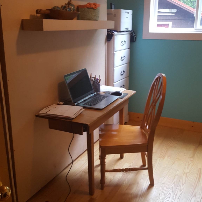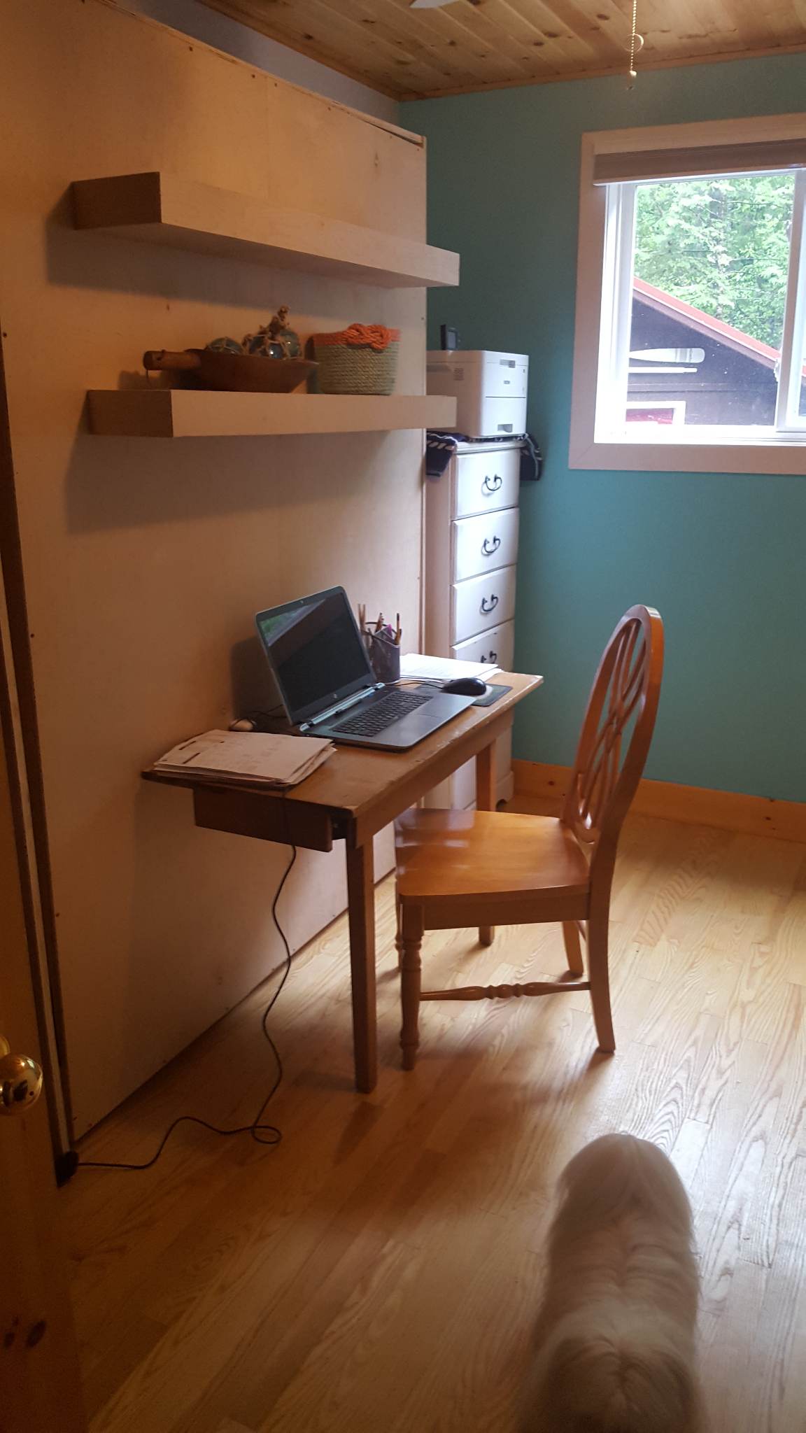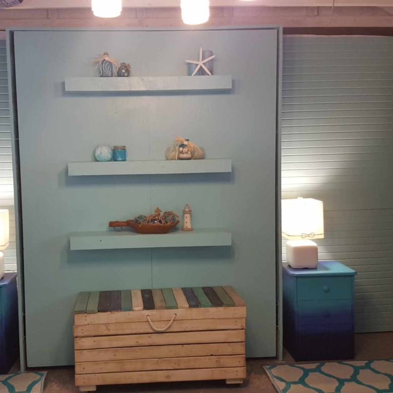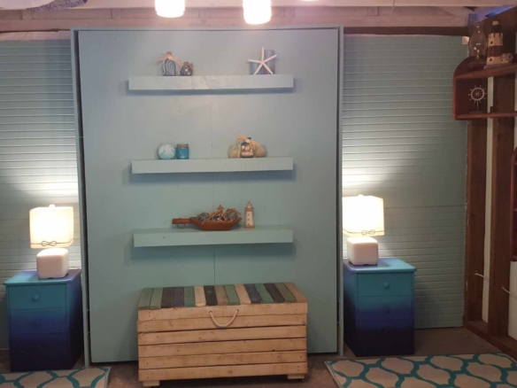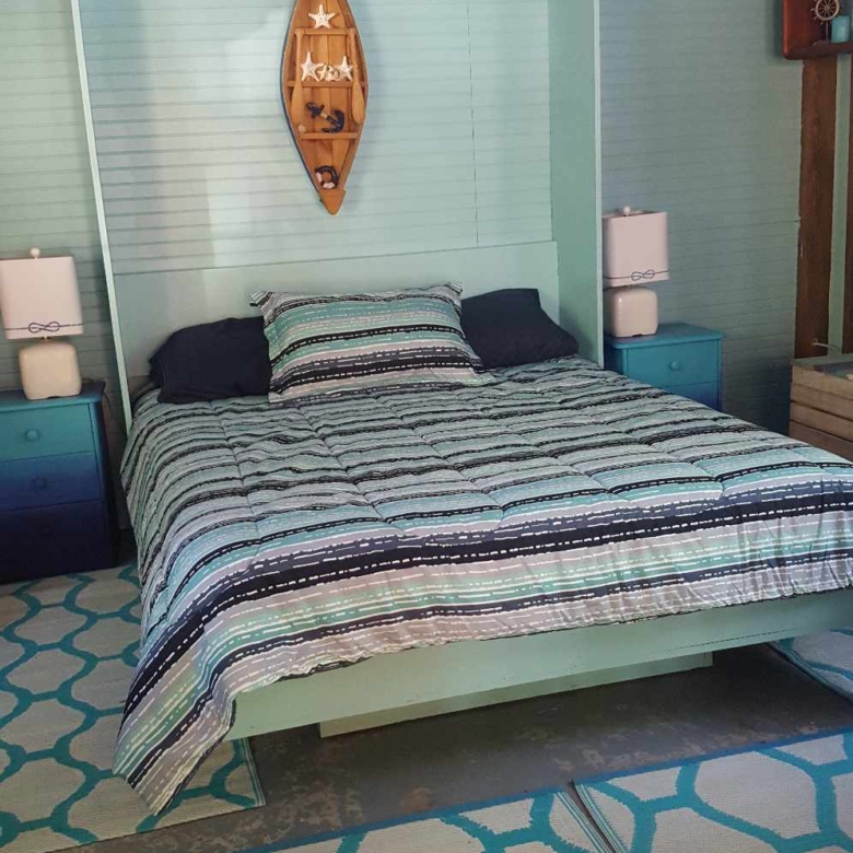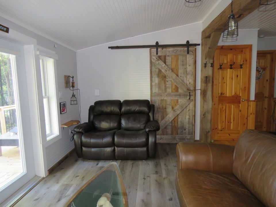 Three season, 200 sq. ft. bunkie with 6×16 pressure treated deck across the front. French doors, large windows, and an open beam ceiling make this area spacious and bright. A queen size Murphy bed keeps the bunkie versatile in use for guests’ sleeping area and as a man-cave or she-shed.