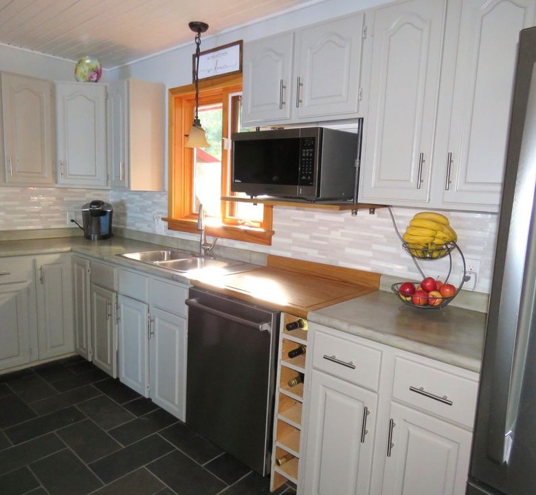Hardwood floors in main living area. Slate tile floor in kitchen. Metal roof on all structures.