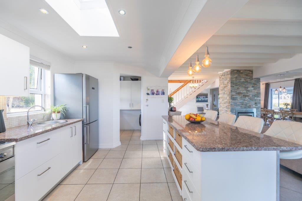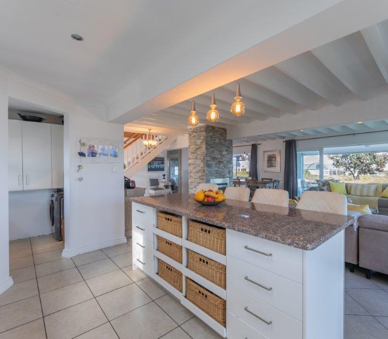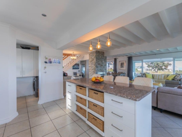 The large open flow kitchen, lounge, dining room, and sunroom all face the sea, allowing for magnificent ocean views from every angle. The kitchen has a scullery and boasts modern finishes and includes an electric oven and gas hob unit with a built-in middle island.