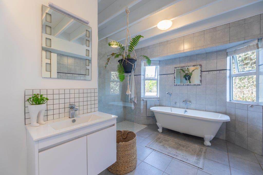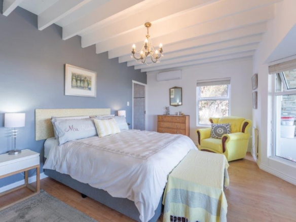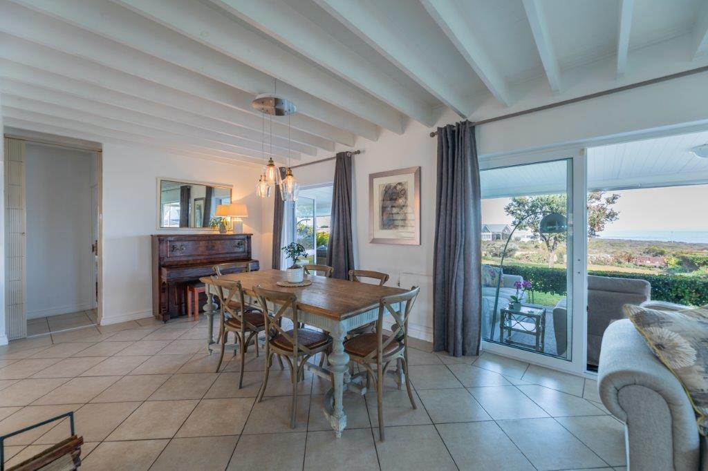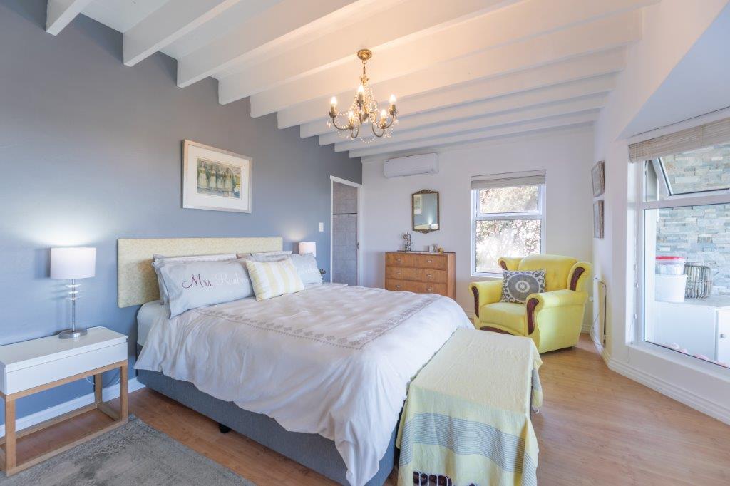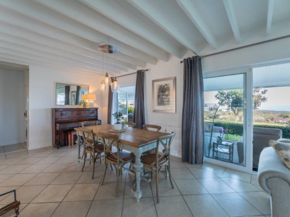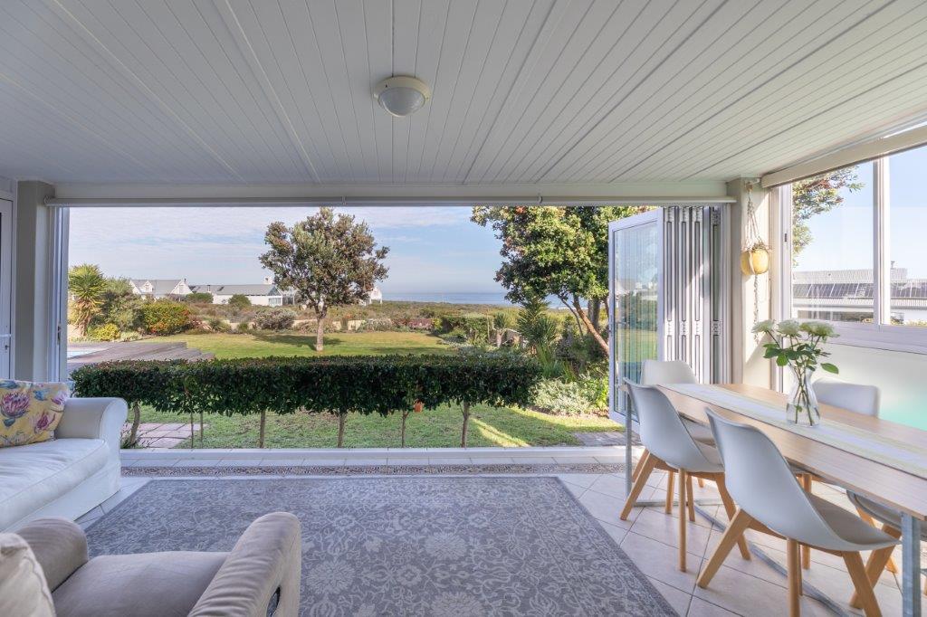 This entertainer’s dream home, has views from the deck which include a built-in barbecue and heated pool, all overlooking the well-established garden, sea, and fynbos greenbelt.