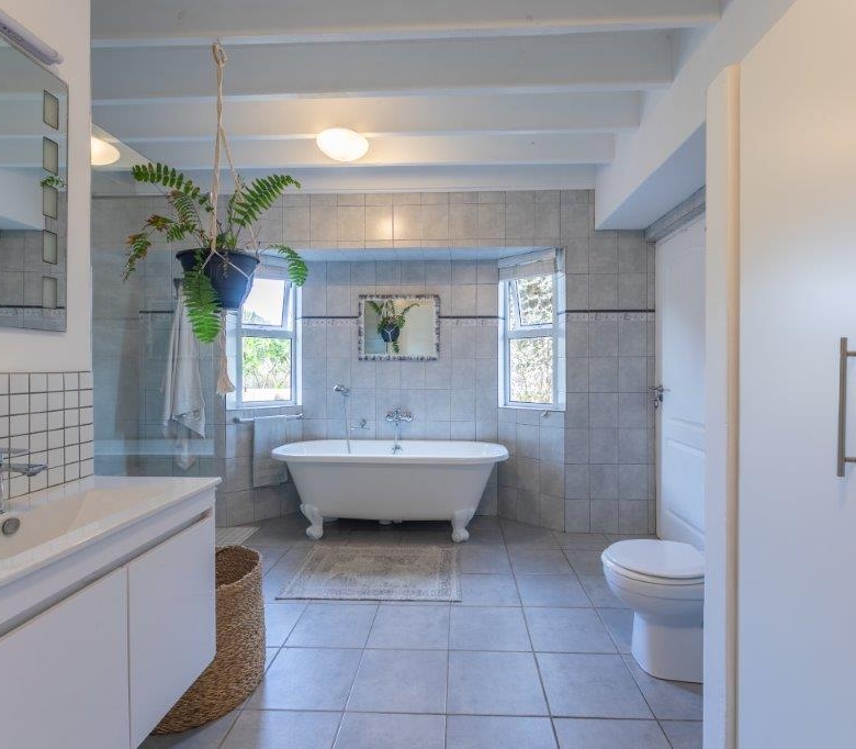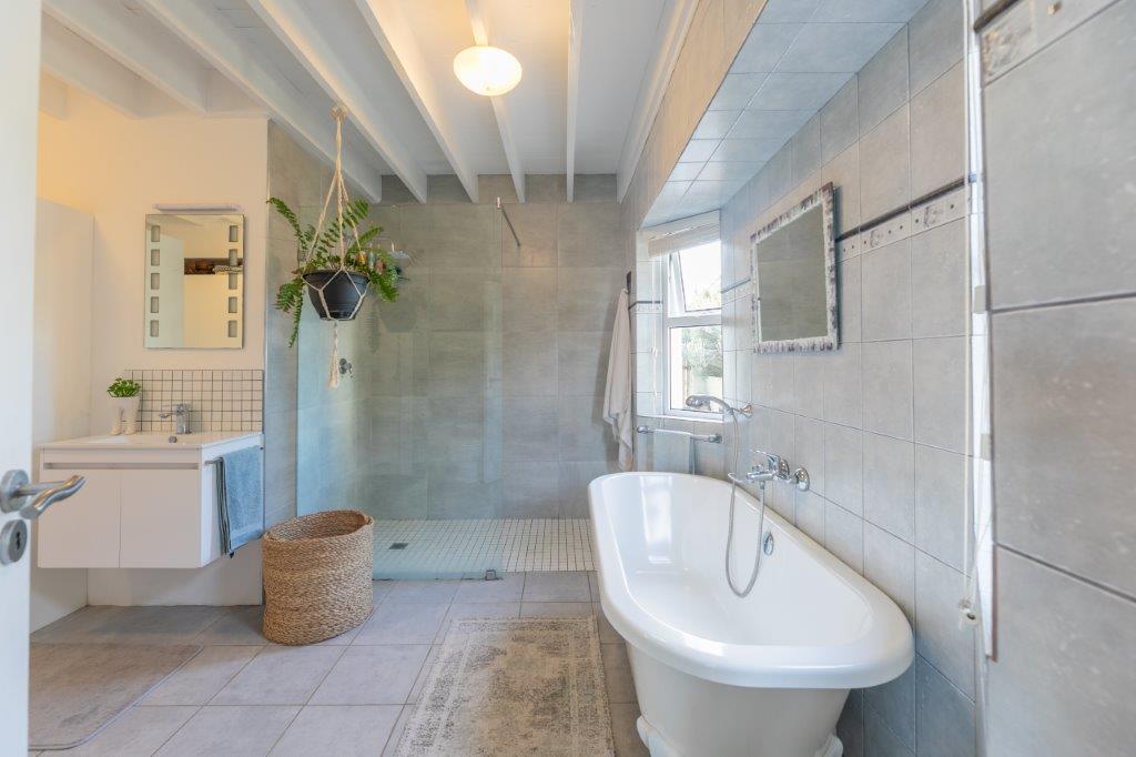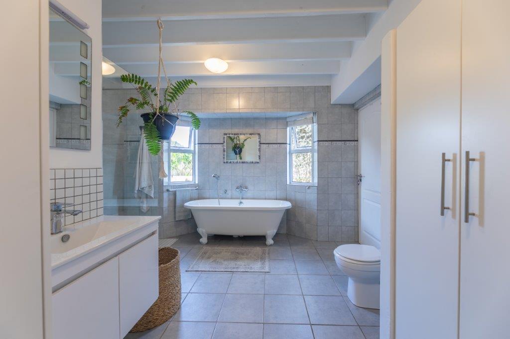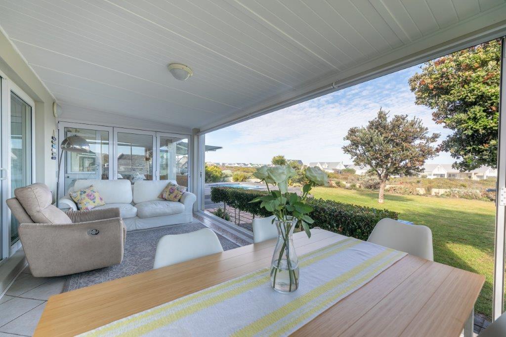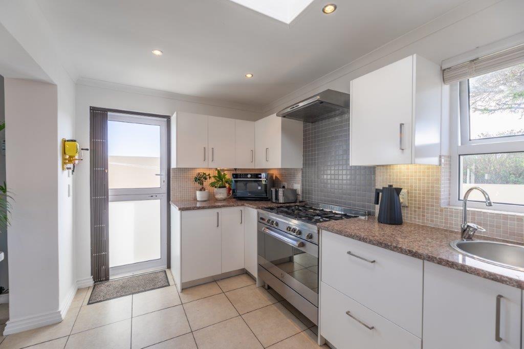 This entertainer’s dream home, has views from the deck which include a built-in barbecue and heated pool, all overlooking the well-established garden, sea, and fynbos greenbelt.