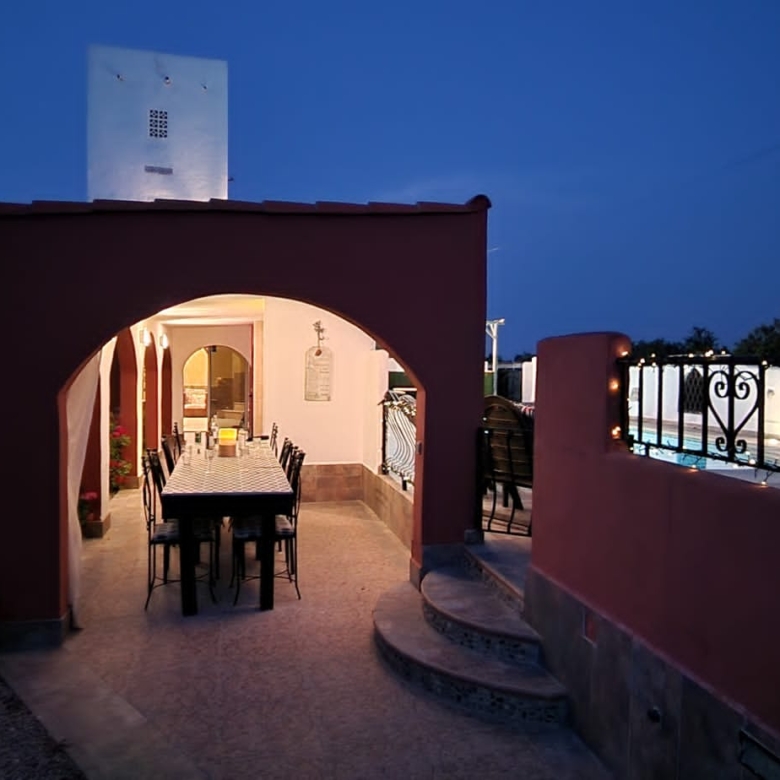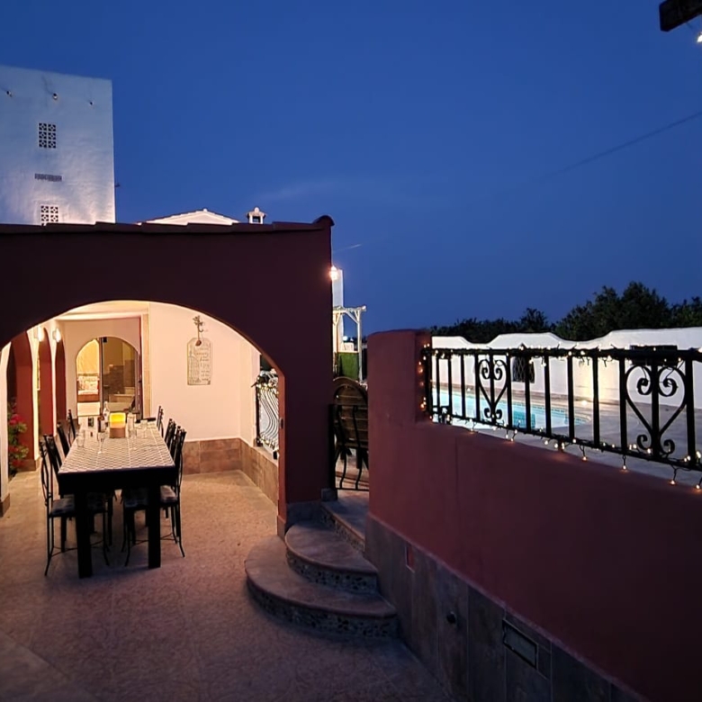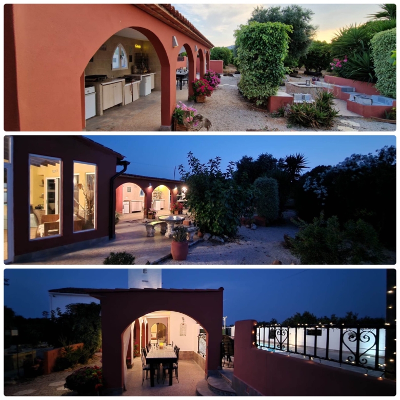 To the outside, there is a beautiful 10×5 meter swimming pool surrounded by tiled terracing, 2 separate gazebos and a solar-powered outside shower, a great place to enjoy the long hot summers. To the right of the pool area, you find a mature landscaped garden which includes a covered summer kitchen equipped with an Outdoor kitchen Paella ring and plancha. Adjacent to the Summer kitchen the covered terrace continues to include a shaded outside dining area furnished with a banquet dining table and chairs. A great place to entertain family and friends at any time of day or night At the centre of the garden you find another seating area with a central firepit for those cooler evenings.
