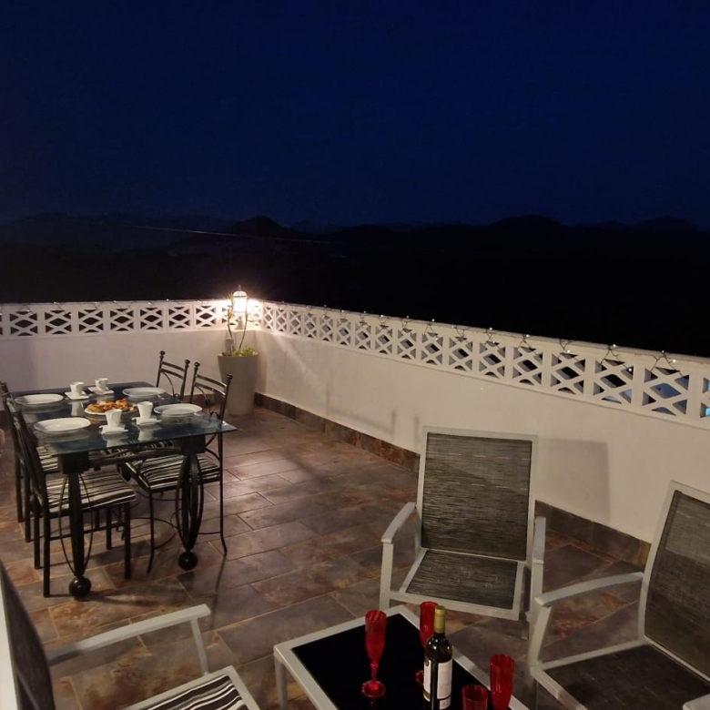 Taking the grand staircase to the first floor you enter a landing area which connects the upper floor, turning right on which you will find 3 spacious double bedrooms, all of which benefit from air conditioning and a spacious modern family bathroom also a large separate terrace with fabulous views over to the pool, orange groves and stunning panoramic views great place for outside dining and get together.