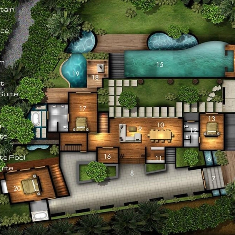 The ocean view master suite is over 180 sqm and overlooks the private plunge pool. it boasts a large walk-in wardrobe and huge bathroom and includes an outdoor bathtub floating in a lily pond. The other 3 ensuite bedrooms also have ocean views while the fifth bedroom has views of the garden and water features. Other highlights of the property include both a designer and wet kitchen, media room, study and deck located on top of the master suite with 180 degrees ocean views, guest bathroom, full staff quarters, laundry room and a garage for 2 cars.