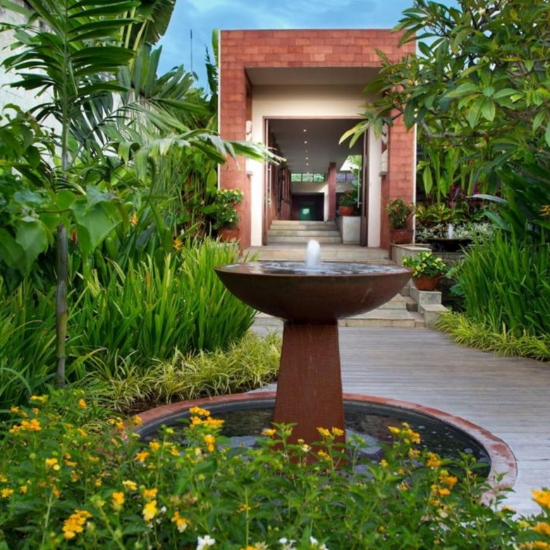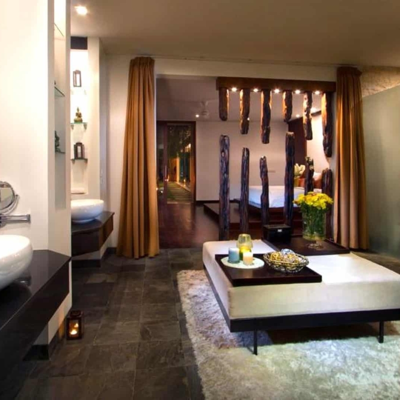 Be greeted by a water fountain and lily ponds as you enter this stunning property and walk through the 4-metre-tall copper and brass door to a collection of indonesian art adorning the 35-metre hall of beautifully laid stonework to reach the foyer. The open plan living areas highlight the lush gardens and large 25m x 7m (1.5m – 3m deep) infinity pool with its own bale and fire features. Gasp at the view expanding the entire 20 metre length of the living and dining space to the gardens, pool and ocean beyond. The main dining room has a “saurwood” 4.5 metre dining table that seats 12 comfortably. The frameless glass door can be closed for air-conditioned comfort or else leave it open to enjoy the outdoor living space and the cool breezes.