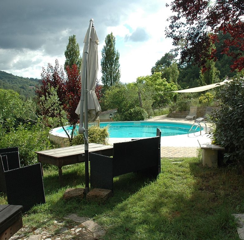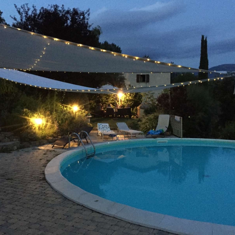 Wooden and wrought iron stairs lead up to the first floor with 4 bedrooms, 2 bathrooms, a large kitchen, another independent entrance with terrace. On the 2nd floor there are 2 bedrooms, a large sitting room and a bathroom. There is also a very big covered garage area with space for 1 car, tool storage area, wine making equipment and wood storage. Outside there is a small building which has the panels on the roof and is a very useful storage area for garden furniture and equipment. The whole house is double glazed and solid chestnut wooden shutters, windows and doors making it easy to lock up when one goes on holiday. The present owner has built up a good network of people to assist in maintaining Domus Nova in good condition. That’s a great advantage of living in a small town!