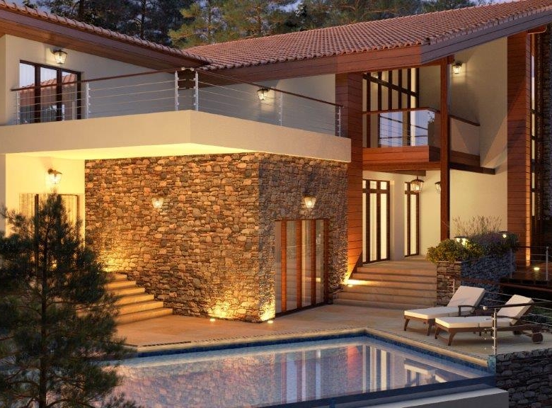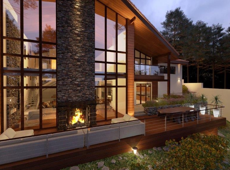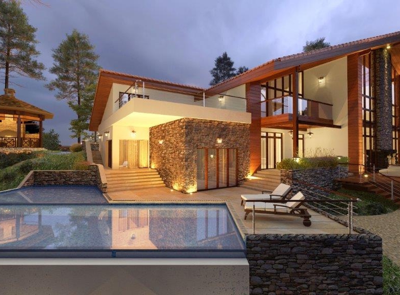 There is an outdoor fireplace, which allows the owners to keep warm on a cool evenings. Trying not to change the original natural relief, a two-level pool was added to the landscape.