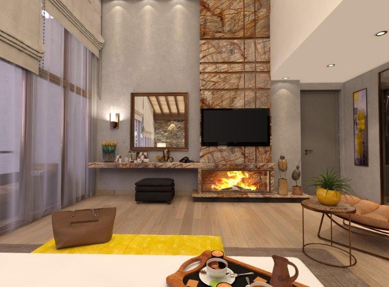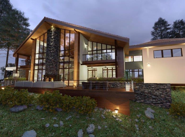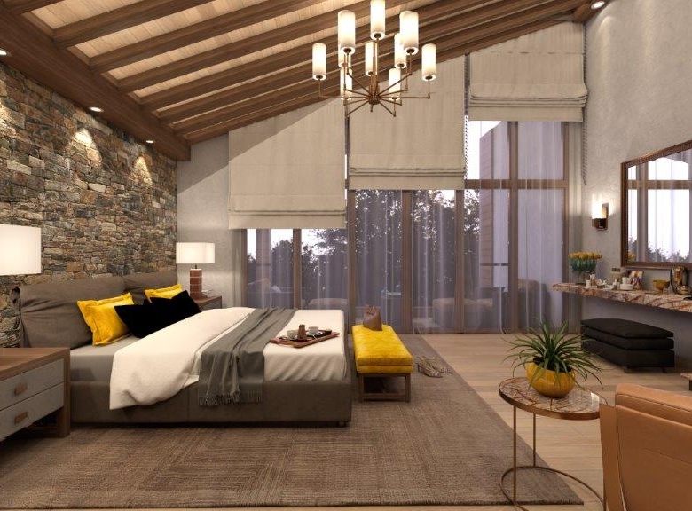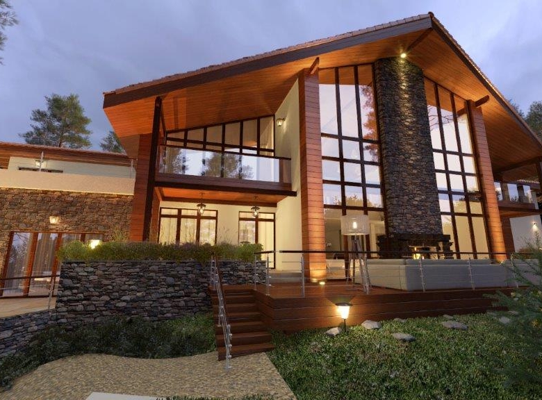 The dominant material in the decoration of all rooms is a wood. However, in order not to overload the premises and not to tear away from the reality, the modernity of the project is also emphasized, using glass partitions, metal and glass constructions, marbles and other modern finishing techniques in the interiors. The signature piece of the interior is a weightless staircase made of metal and glass. The central place in the living room is a fireplace; massive and lined with rough stone, which is the main compositional centre of the double light living room.