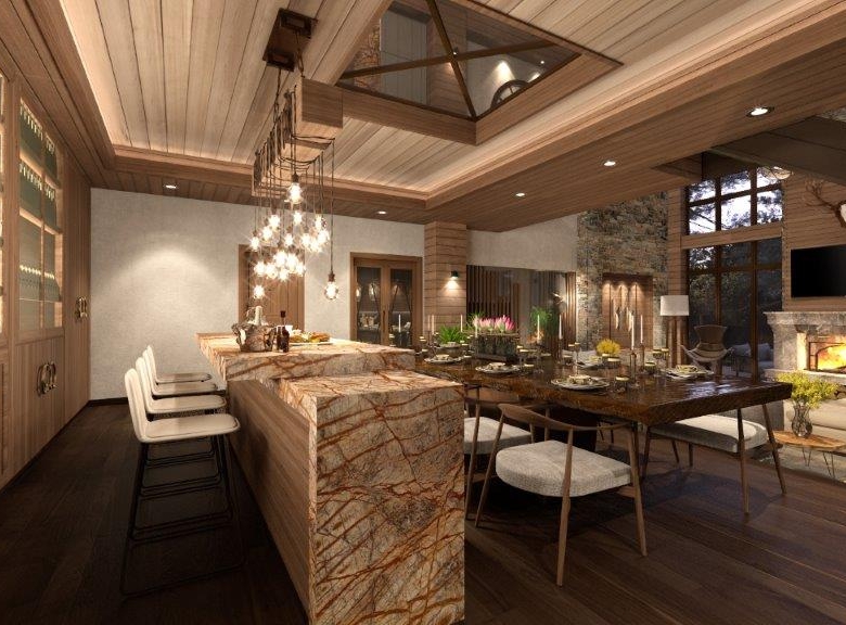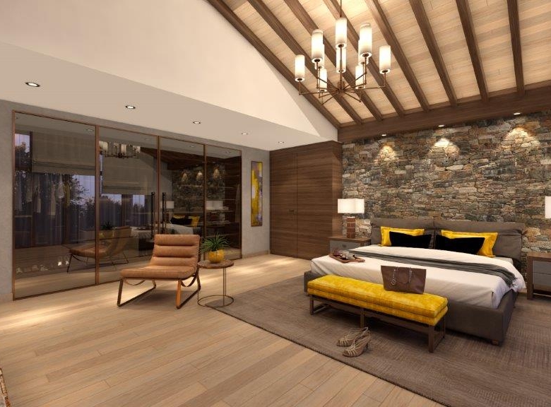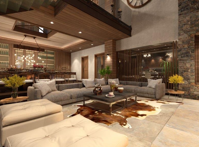 Le Grand Chalet has a covered area for the comfortable stay of a large family – 826 S/M. The chalet has five bedrooms with bathrooms and dressing rooms, a study, a living-dining room with double light and a massive fireplace, a spacious kitchen, a maid’s room, technical rooms, security room a spa with pool and sauna, gym, Cava and a home cinema.