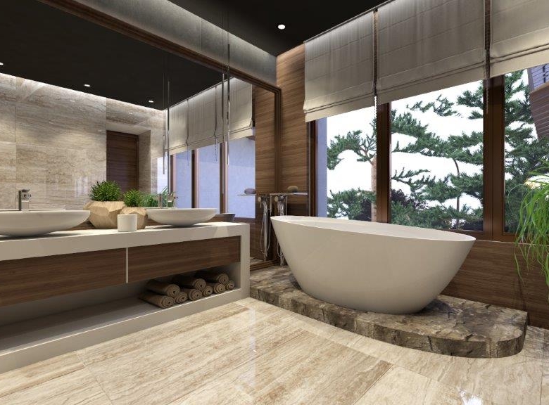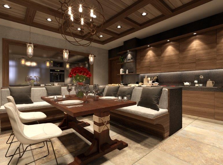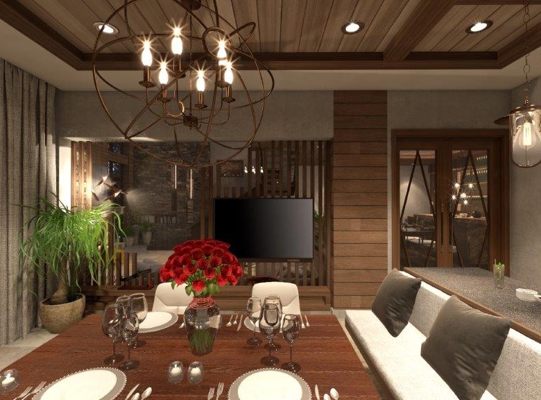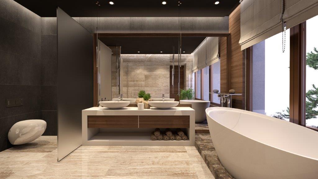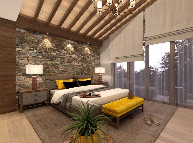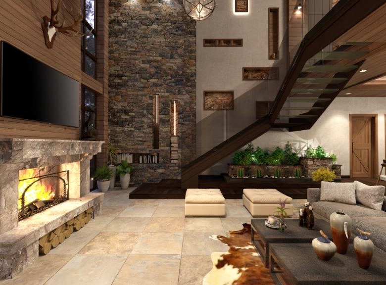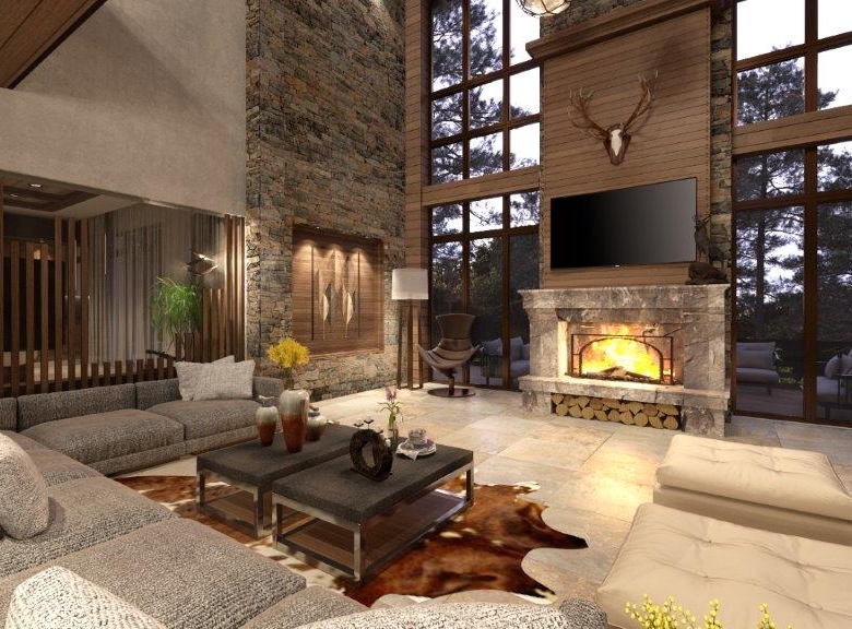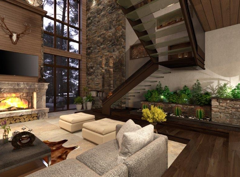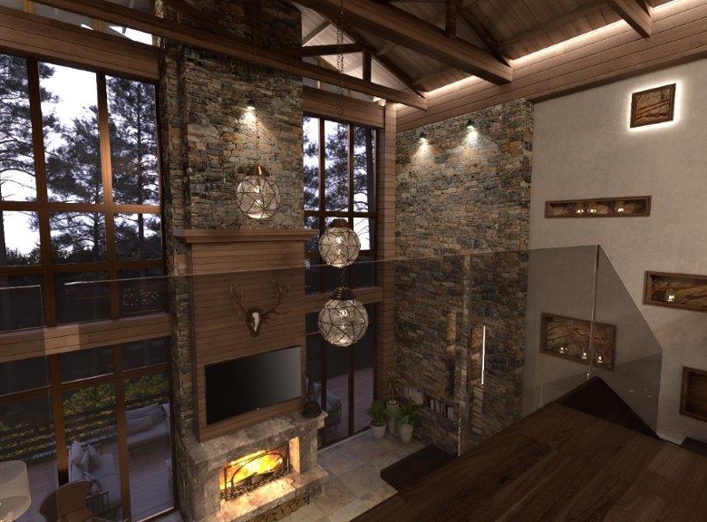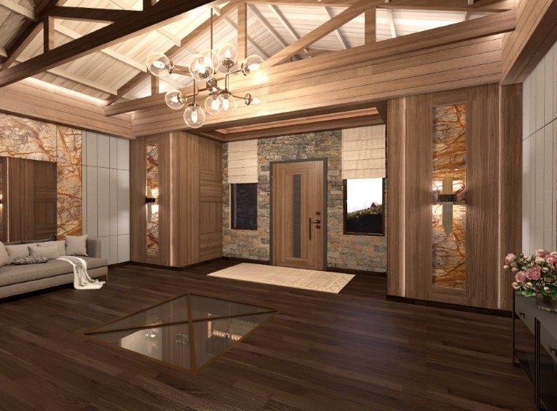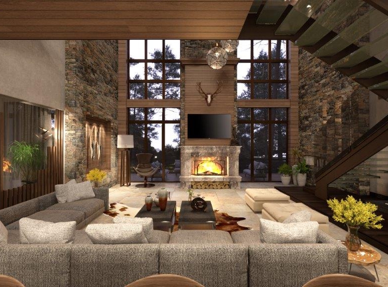 The dominant material in the decoration of all rooms is a wood. However, in order not to overload the premises and not to tear away from the reality, the modernity of the project is also emphasized, using glass partitions, metal and glass constructions, marbles and other modern finishing techniques in the interiors. The signature piece of the interior is a weightless staircase made of metal and glass. The central place in the living room is a fireplace; massive and lined with rough stone, which is the main compositional centre of the double light living room.