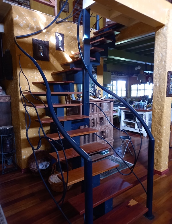 On the upper floor of the main house, you’ll find a large TV/music room ( 40m2). Adjacent to the TV/music room, there is a bohemian sunroom (also 40m2.) This sunroom serves multiple purposes, functioning as an art studio and office space. With its abundance of natural light, it provides an inspiring environment for creative pursuits or a peaceful workspace .All floors and ( cathedral) ceilings throughout the property are constructed with beautiful wooden materials. The roof has Spanish tiles.