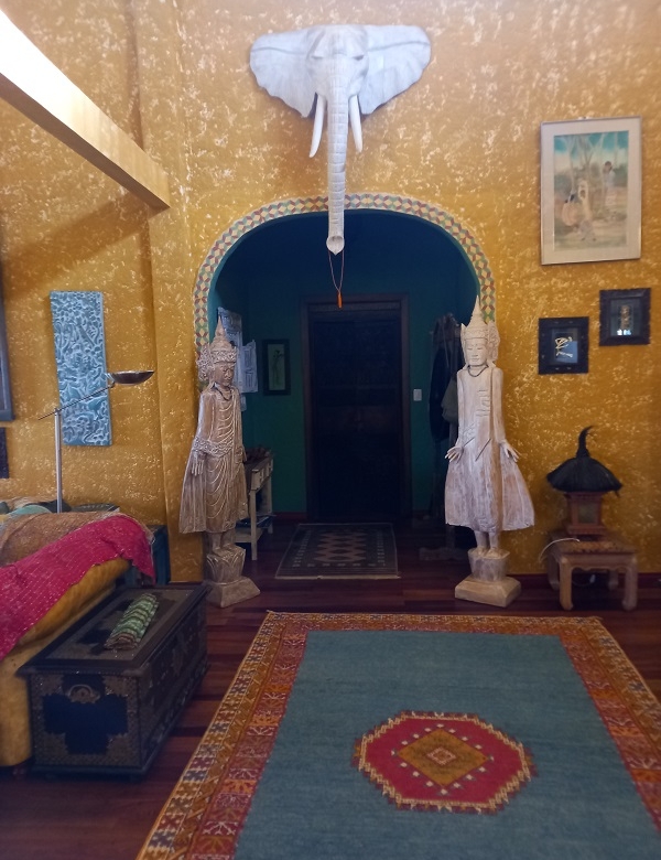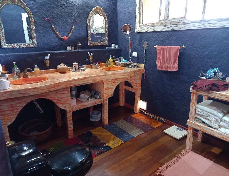 Continuing down the corridor to the right of the living room, you’ll find the laundry room. a guest toilet , a guest room, complete with a kingsize bed and a Moroccan-style bathroom,and another guest room.