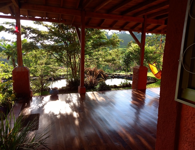 The house boasts a large wooden terrace facing the sunset. This outdoor space is an idyllic spot to enjoy the breath-taking views and take in the tranquility of the surroundings. The terrace overlooks a stunning koi pond with lush plants.