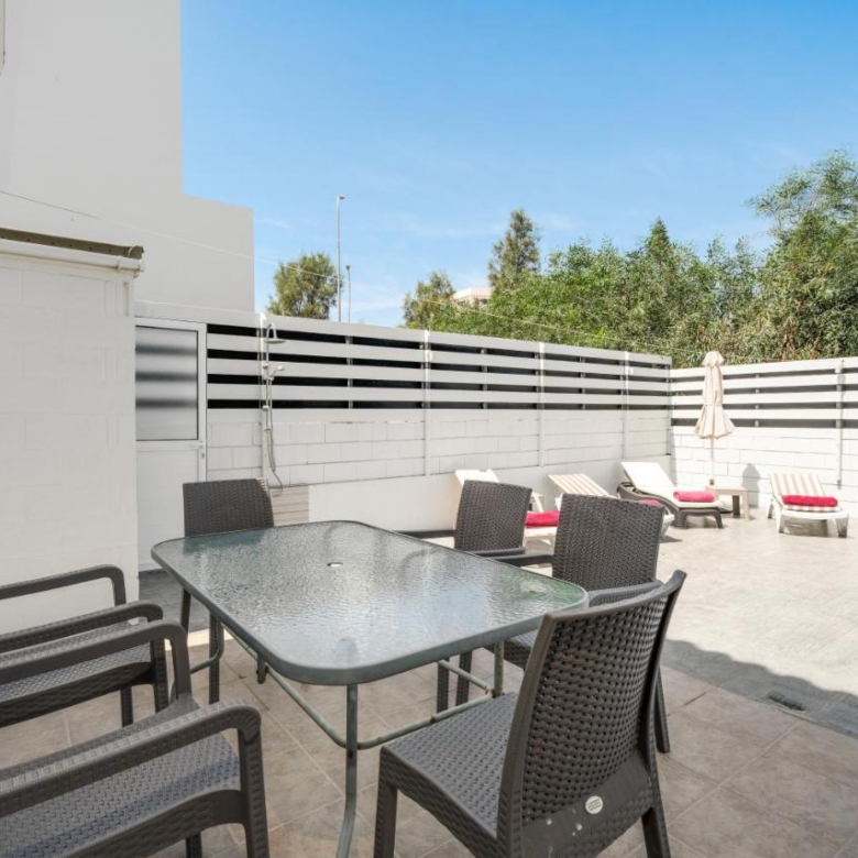 * Open-Plan Living: The heart of the villa unfolds in the expansive open-plan living room, dining area, and kitchen. This light-filled space fosters a sense of connection and allows for effortless entertaining. Imagine preparing meals in the well-equipped kitchen while still being part of the conversation or unwinding in the comfortable living area after a day of exploration. Sliding doors lead out to the inviting seating area at the front of the property, perfect for enjoying your morning coffee in the gentle Cypriot sunshine.