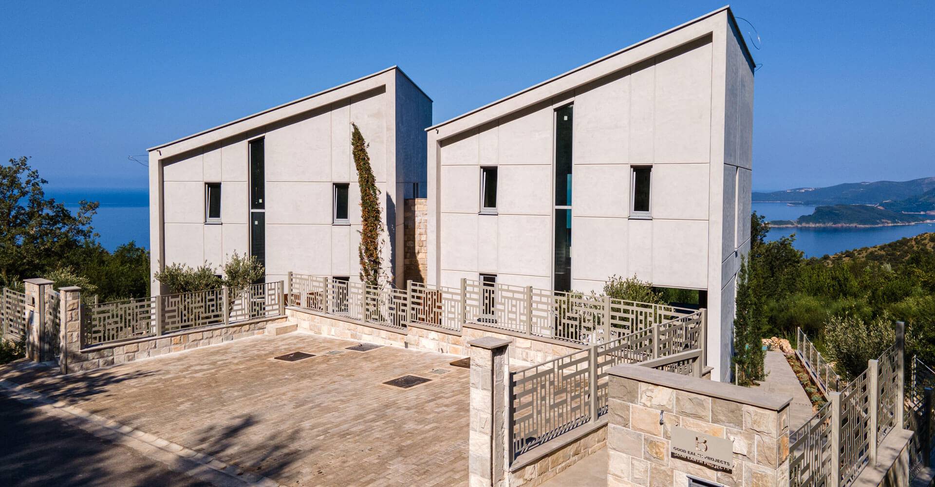 Situated in Tudorovici hill above Sv Stefan, one of the most picturesque parts of the Budva Riviera, the Villas are harmoniously nestled on a hill with breathtaking views of the Adriatic sea against mountains at the back. The villas offer sustainable living with high-quality, contemporary design supported by the latest sustainable technologies. Once completed, they will be the first carbon-natural residential properties in Montenegro.Each villa has four levels. On the first level, a double-height living room, dining area, and modern kitchen are arranged in an open plan, seamlessly continuing to the outside terraces, infinity pool, and landscaped garden overlooking the Adriatic Sea. The second level consists of an entrance gallery with a sea view of the double-height living room, master bedroom with sea view, ensuite bathroom, walk-in changing room, and free-standing bath with sea view. On the third level, there are two double bedrooms with sea views, one single bedroom, and two bathrooms with mountain views. The plant room and large storage area are positioned at the top.The villas are the first carbon-neutral buildings in Montenegro designed to the highest European standards. Villas photovoltaic panels generate electricity, and the energy surplus produced is returned to the grid, targeting zero energy bills. The latest innovative technologies have improved user experience and provided maximum energy efficiency. Features include:▪ Photovoltaic solar panels producing 10k/W▪ Passive house standard thermal insulation▪ STO façade render system▪ Triple glazing low-energy glass▪ Underfloor heating by heat pumps▪ High-efficiency cooling▪ Heat recovery ventilation system▪ Orientation to maximize exposure to the sun▪ Orientation maximizing views & privacy▪ Natural materials with anti-allergenic qualities▪ Electrical car chargers▪ Rainwater recycling▪ Smart Home next-generation AI systemThe project is part of the Good Earth Project’s mission to create habitats that excel in form and function. The villas incorporate integrated solutions for sustainable living without compromising on comfort and quality of the experience. They are equipped with amenities and features usually reserved for properties of the highest luxury in size and value. The amenities are harmoniously integrated to enhance the living experience without requiring extensive maintenance and upkeep. Features include:▪ Terrace pergola with the sun, rain, and wind protection▪ Infinity pools with seawater equipped with:▪ No-chemical automatic filtering system▪ Hydro massage▪ Swim Jet counter current system▪ High-pressure shower▪ Garden automated irrigation system▪ Car parking for two cars▪ Free-standing bath with open views▪ 6 meters high ceilings over the living room▪ Smart house with AI control systemTwo distinctive characters define the site context: the sea and the mountain. Located 250m above the sea and some 500m from the coastline, the site benefits from outstanding 180-degree views of the Adriatic Sea, with the island of Sveti Nikola in its background. To the northeast of the site, the peaks and ridges of the mountain Pastovska Gora form the backdrop. Postovska Gora is well known for its stunning trails and hikes.Mediterranean cypresses were planted along the villas’ side façades, softening the modern structures. The landscaped gardens are additionally enriched with indigenous low-growing plants. Sculptural privacy panels along the border between the villas add to privacy and provide a fun, artistic feel. Trees and plants are chosen to survive the local environment with minimal maintenance and watering. A fully automated irrigation system using collected rainwater ensures the well-being of the landscaped gardens.VILLA A, 227m², price 850.000€Villa A has been fully completed externally, including the swimming pool. Services and utilities have been connected and brought inside the villa, ready to distribute inside the interior. Interior walls with service ducts and electrical conduits have been positioned and are prepared for fit-out and decoration. The buyer has an option to specify their interior. Alternatively, they can choose the same interior as the fully finished Villa B. The buyer can build the interiors themselves or engage the developer to finish.VILLA B, 231m², price 1.150.000€Villas B is fully finished; even the swimming pool is filled with water, ready for move-in. The interior designs combine a light and airy feel with the richness of textures and materials. Artisan features and highly sustainable technologies work hand in hand to support comfortable living. The sense of comfort is achieved by carefully positioning key sculptural forms: the stairs and central panel in patinated metal and the kitchen island in concrete. The quality of the materials and craftsmanship is celebrated in every detail. Through design elements and indoor greenery, the interior space embraces the beauty of nature and creates an ever-evolving interior.Budva Riviera is the center of Montenegro’s tourism. It is best known for its Venetian architecture, historical monuments, sandy beaches, and diverse nightlife. The 38km long coast, with 17 beaches and turquoise waters, is one of the Mediterranean’s most striking stretches of coastline. Tudorovici, a quiet hill-side village, is located some 15 min drive from Budva and home to an easy-going international community. The area overlooks Sveti Stefan and the pristine Crvena Glavica beach. Just minutes away from the bustling crowds, unspoiled nature and rich vegetation surround the properties and provide a peaceful backdrop forperfect relaxation.Discover the elegance and sophistication of this exclusive property –click here for a captivating video tourand experience its luxury firsthand.